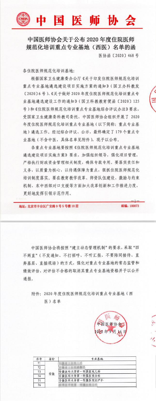 9月16日,中国医师协会公布2020年度住院医师规范化培训(以下简称住培)重点专业基地名单,我院全科、妇产科、儿科专业获评,是安徽省获评专业基地数量最多的单位。