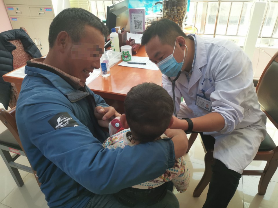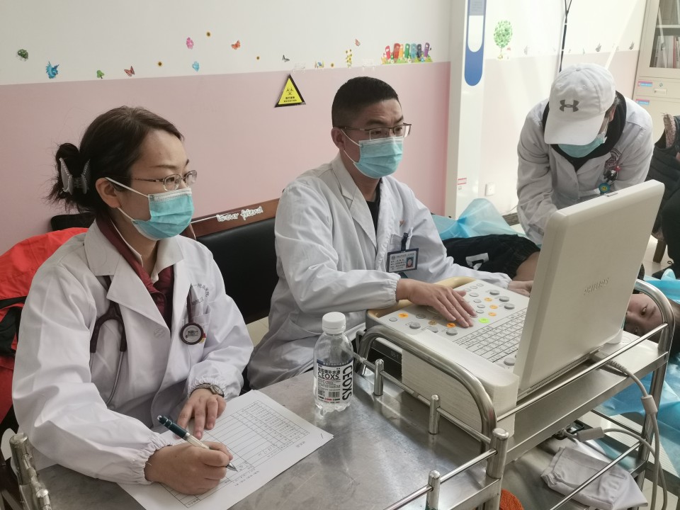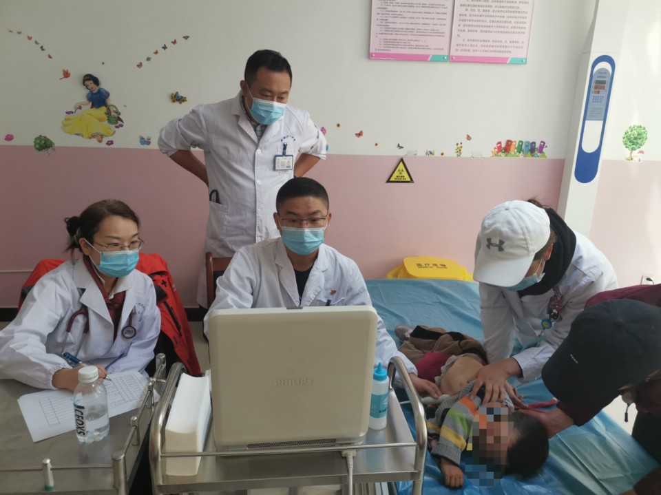 在洛扎县,为加快完成筛查任务,减少当地群众的等待时间,专家组决定先筛查后用餐。筛查分为听诊和彩超检查,心脏大血管外科董文鹏逐一对每名疑似患儿进行听诊检查,对发现有不正常杂音的患儿由心脏彩超室金朝龙、心血管内科赵韧进行彩超检查,确诊患儿由专家组结合彩超结果、集体讨论确定。经过连续3个小时的工作,专家组完成了对16名疑似患儿的筛查。