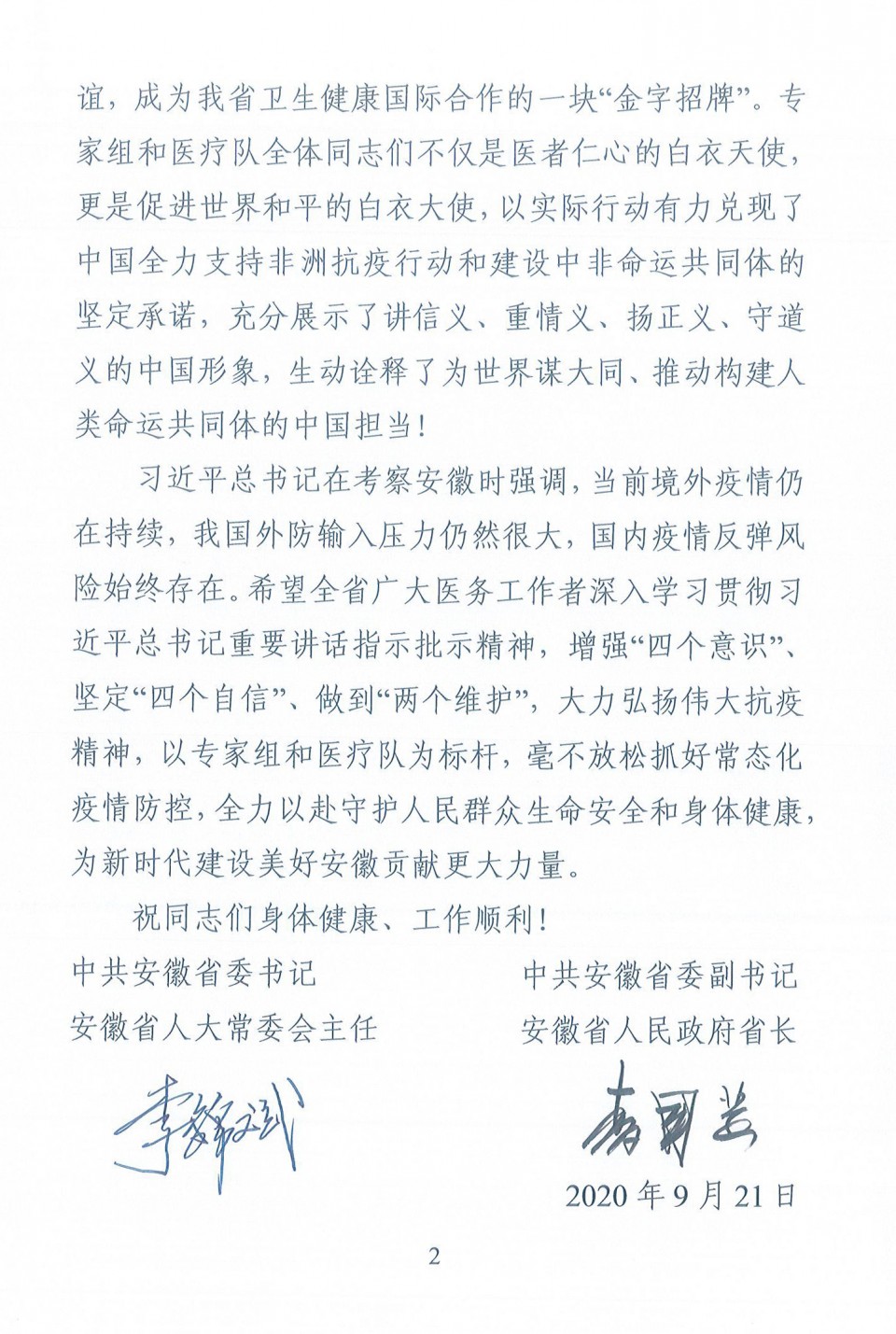 信中勉励全省广大医务工作者深入学习贯彻习近平总书记重要讲话指示批示精神,增强“四个意识”、坚定“四个自信”、做到“两个维护”,大力弘扬伟大抗疫精神,以专家组和医疗队为标杆,毫不放松抓好常态化疫情防控,全力以赴守护人民群众生命安全和身体健康,为新时代建设美好安徽贡献更大力量。