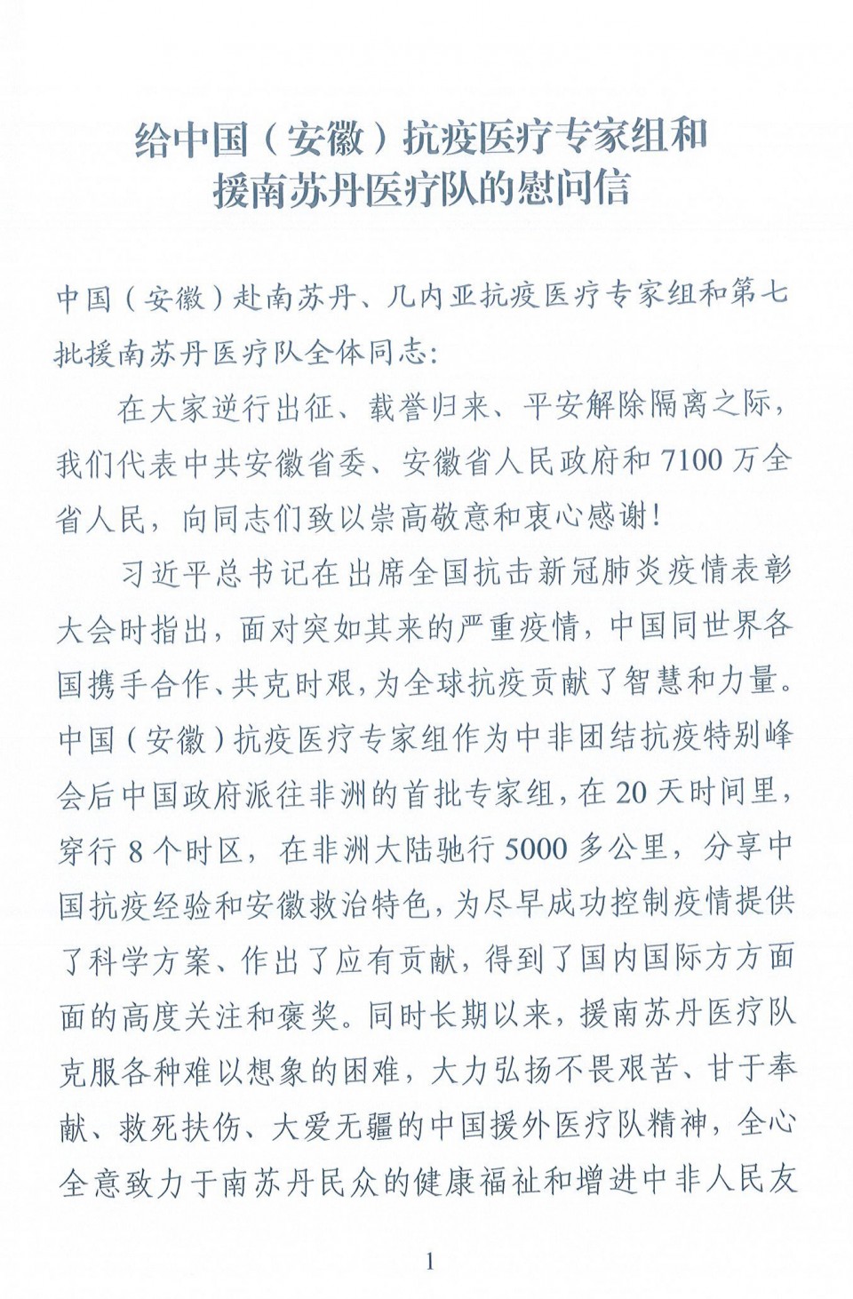 日前,安徽省委省政府来信,向中国赴南苏丹、几内亚抗疫医疗专家组致以崇高的敬意和衷心的感谢。