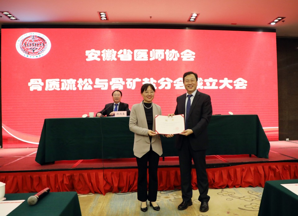 梁朝朝为代芳主委颁发证书。代芳表示,将认真履行职责,为提升我省骨质疏松与骨矿盐疾病的诊疗水平、推动学科建设和发展做出积极的努力。
