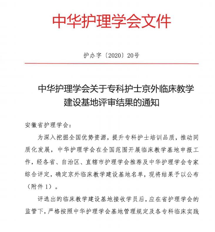近日,医院经过安徽省护理学会评审和推荐及中华护理学会综合评定,顺利获批麻醉、儿科、呼吸、骨科、糖尿病、护理管理六个专科护士京外临床教学基地。