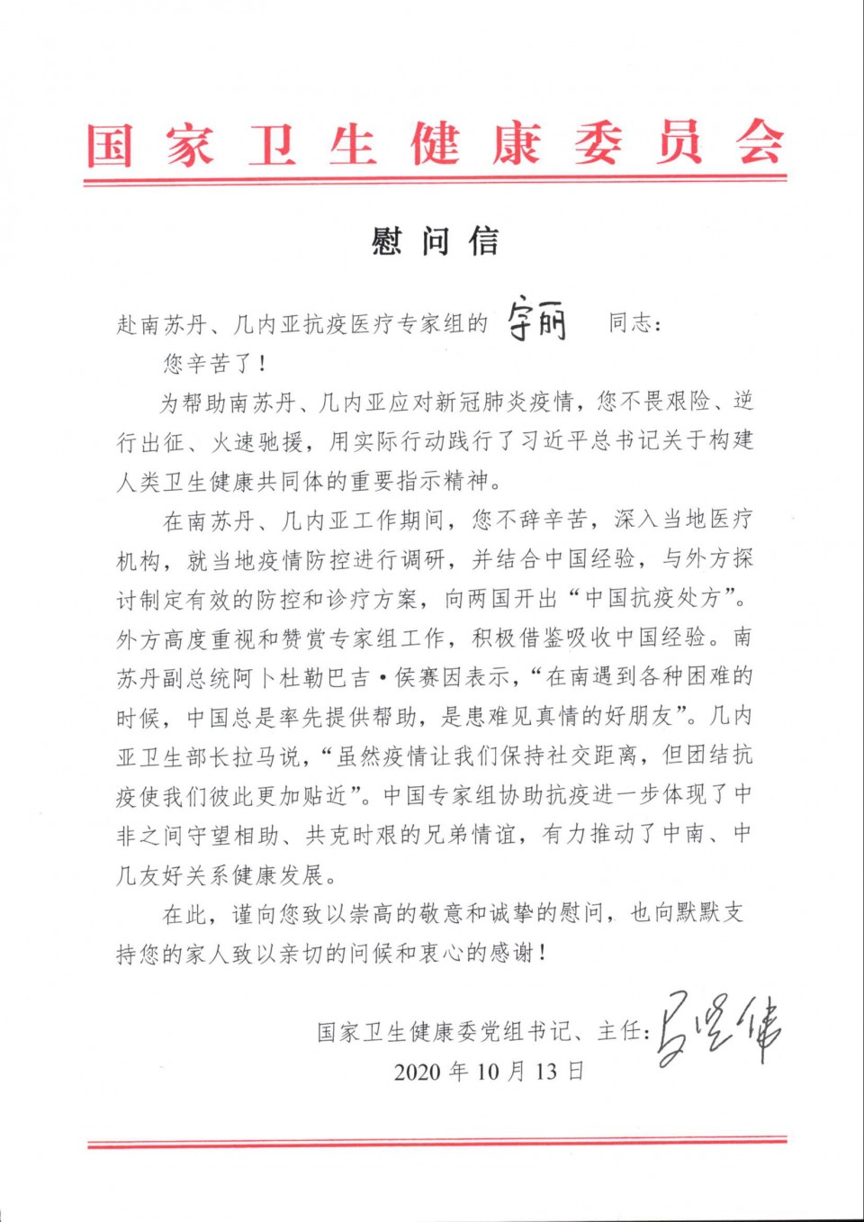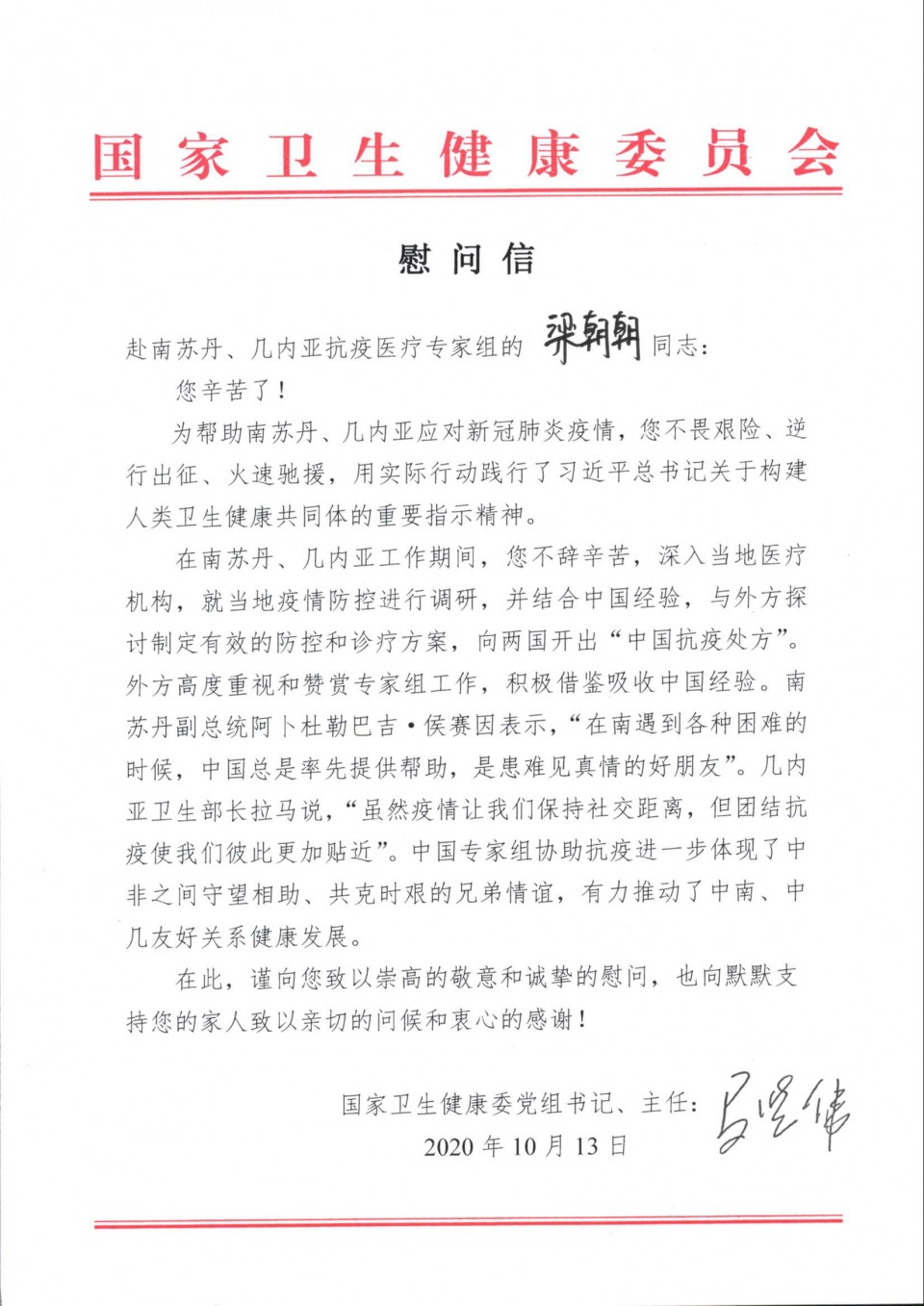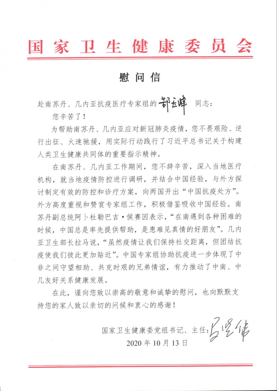 日前,国家卫生健康委党组书记、主任马晓伟致信我院赴南苏丹、几内亚抗疫的医疗专家梁朝朝、郜玉峰、宇丽,向他们致以崇高的敬意和诚挚的慰问,也向默默支持他们的家人致以亲切的问候和衷心的感谢。