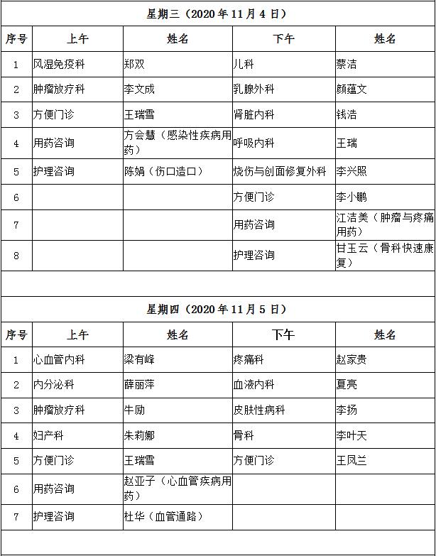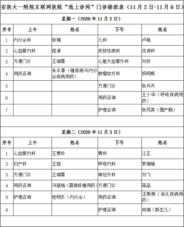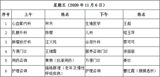 11月2日至11月6日互联网医院“线上诊间”门诊排班如下: