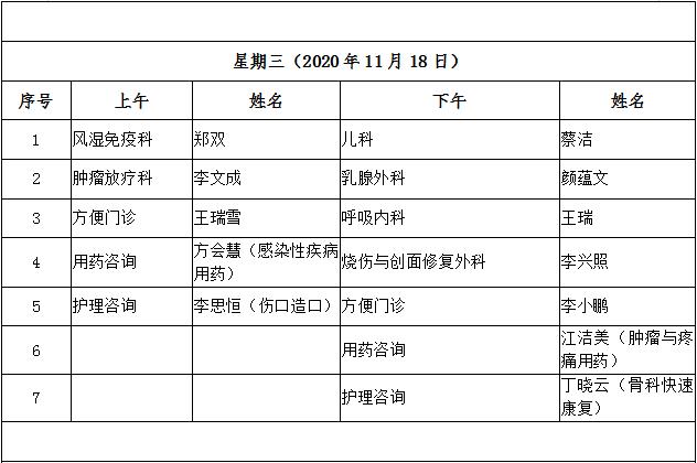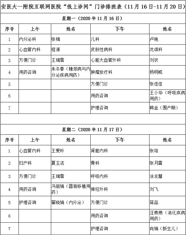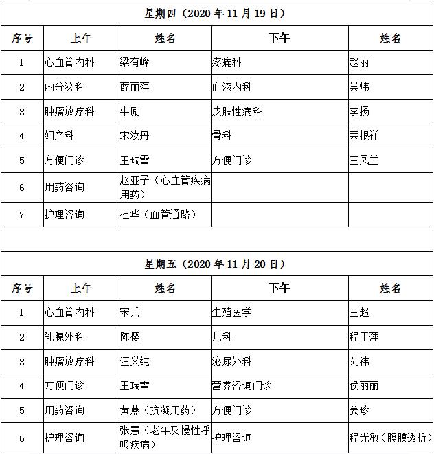 11月16日至11月20日互联网医院“线上诊间”门诊排班如下: