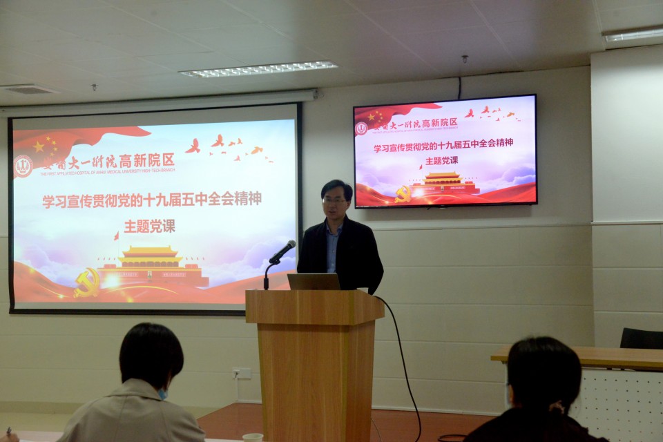 11月11日晚,高新院区副院长陈旭林在消化内镜中心会议室为联系党支部党员讲授题为《学习宣传贯彻党的十九届五中全会精神》的主题党课。妇产科第二党支部、生殖中心党支部、心脏大血管外科党支部的党员和入党积极分子参加学习。