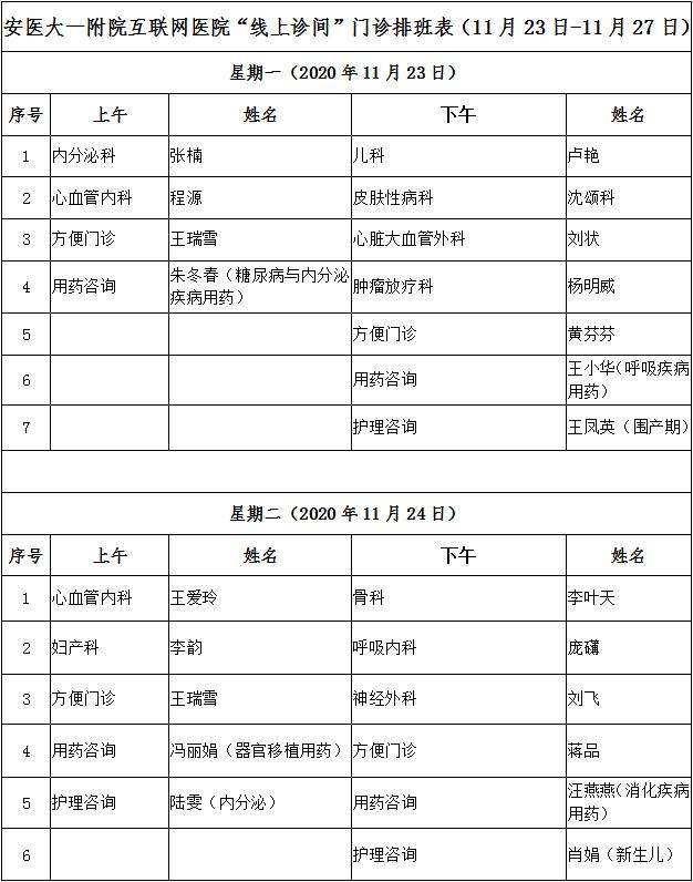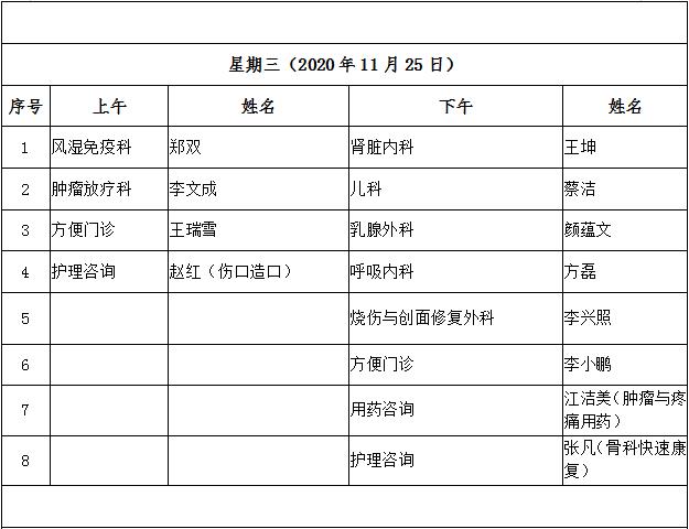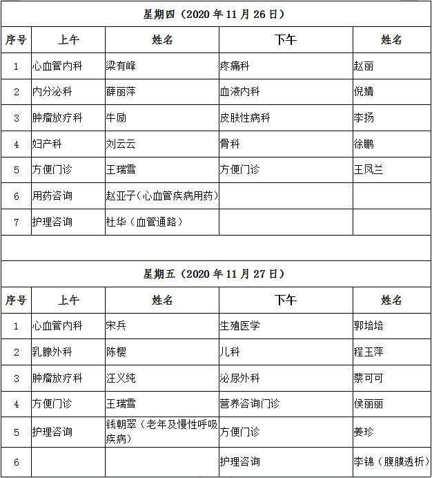 11月23日至11月27日互联网医院“线上诊间”门诊排班如下: