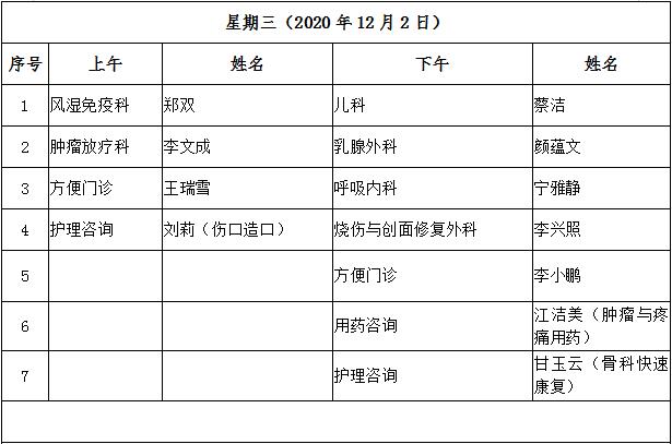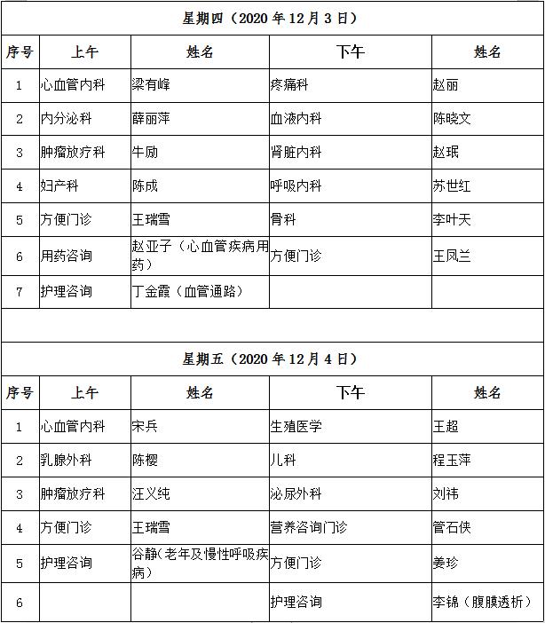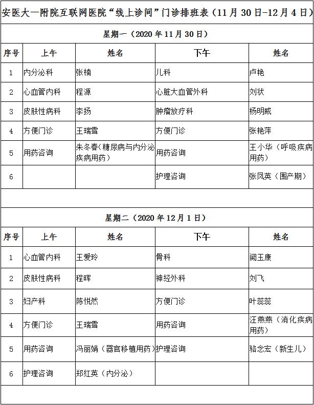 11月30日-12月4日互联网医院“线上诊间”门诊排班如下:
