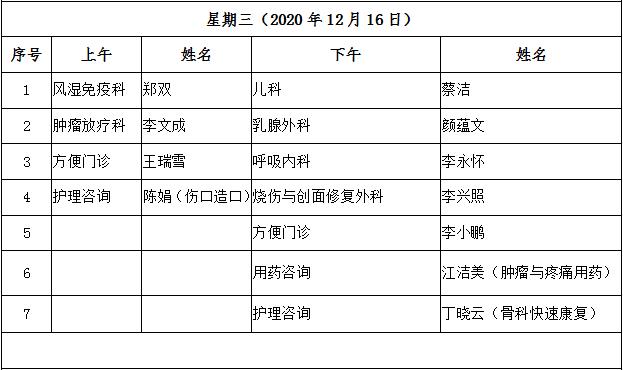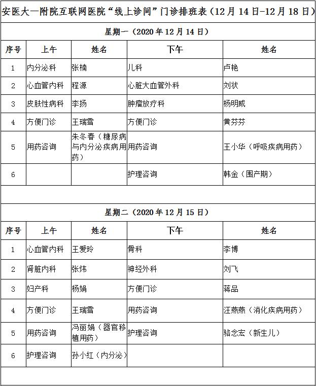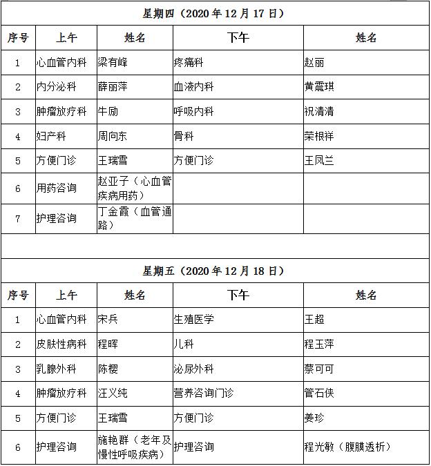 12月14日-12月18日互联网医院“线上诊间”门诊排班如下: