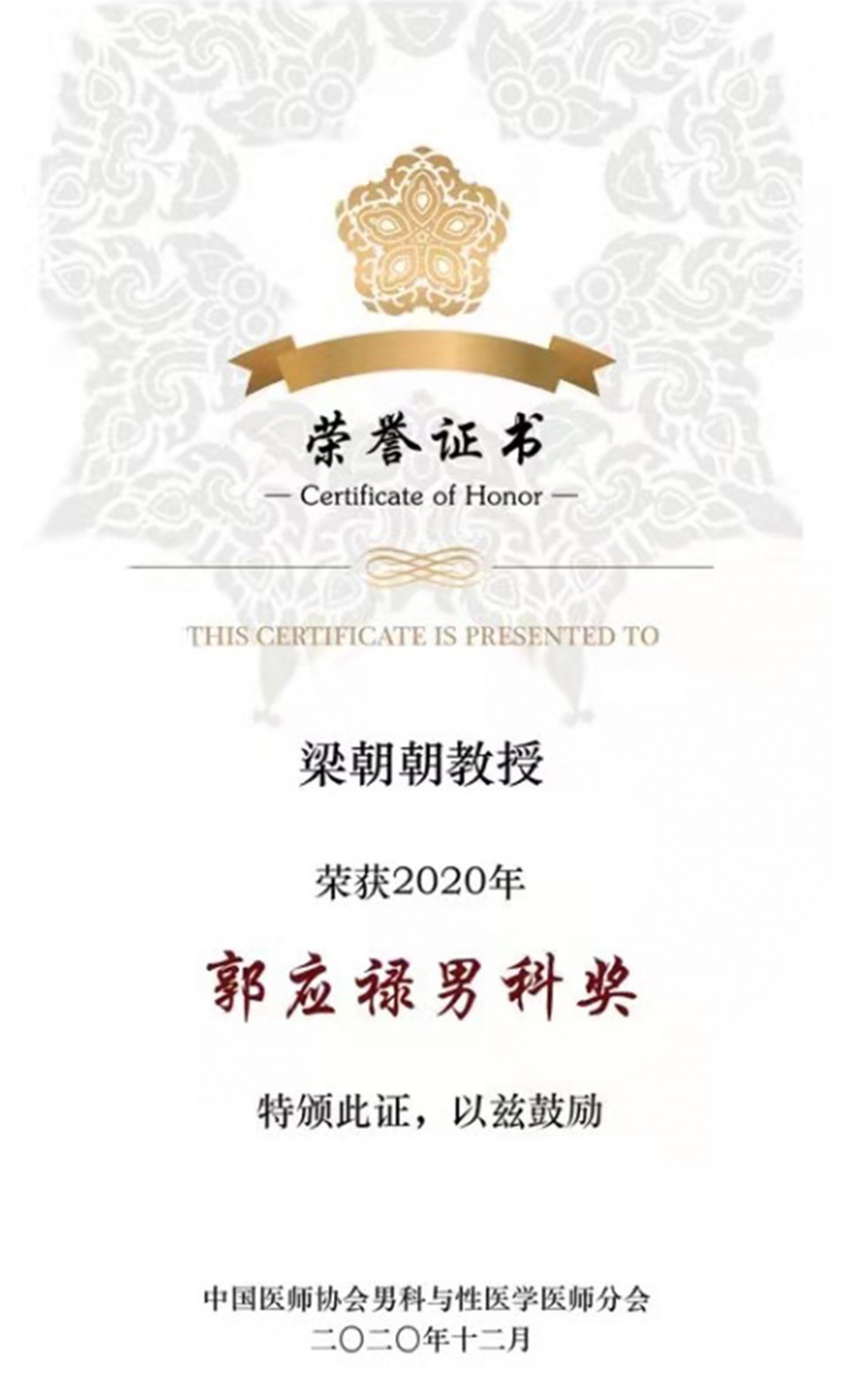 “郭应禄男科奖”是由北京郭应禄泌尿外科发展基金会发起,由中国医师协会男科与性医学医师分会负责评选的我国男科学届最高奖项,每年仅评选两人,以表彰其在男科领域的卓越贡献。我院梁朝朝教授推动了以症状为基础的中国特色的慢性前列腺炎临床与基础研究,建立了以症状为核心的慢性前列腺炎诊断及疗效评判标准并在全国推广应用,揭示了慢性前列腺炎发病机制,提出了“前列腺盆腔综合征”新理念,相关研究成果被国内外指南引用,改变了对慢性前列腺炎的传统认识。