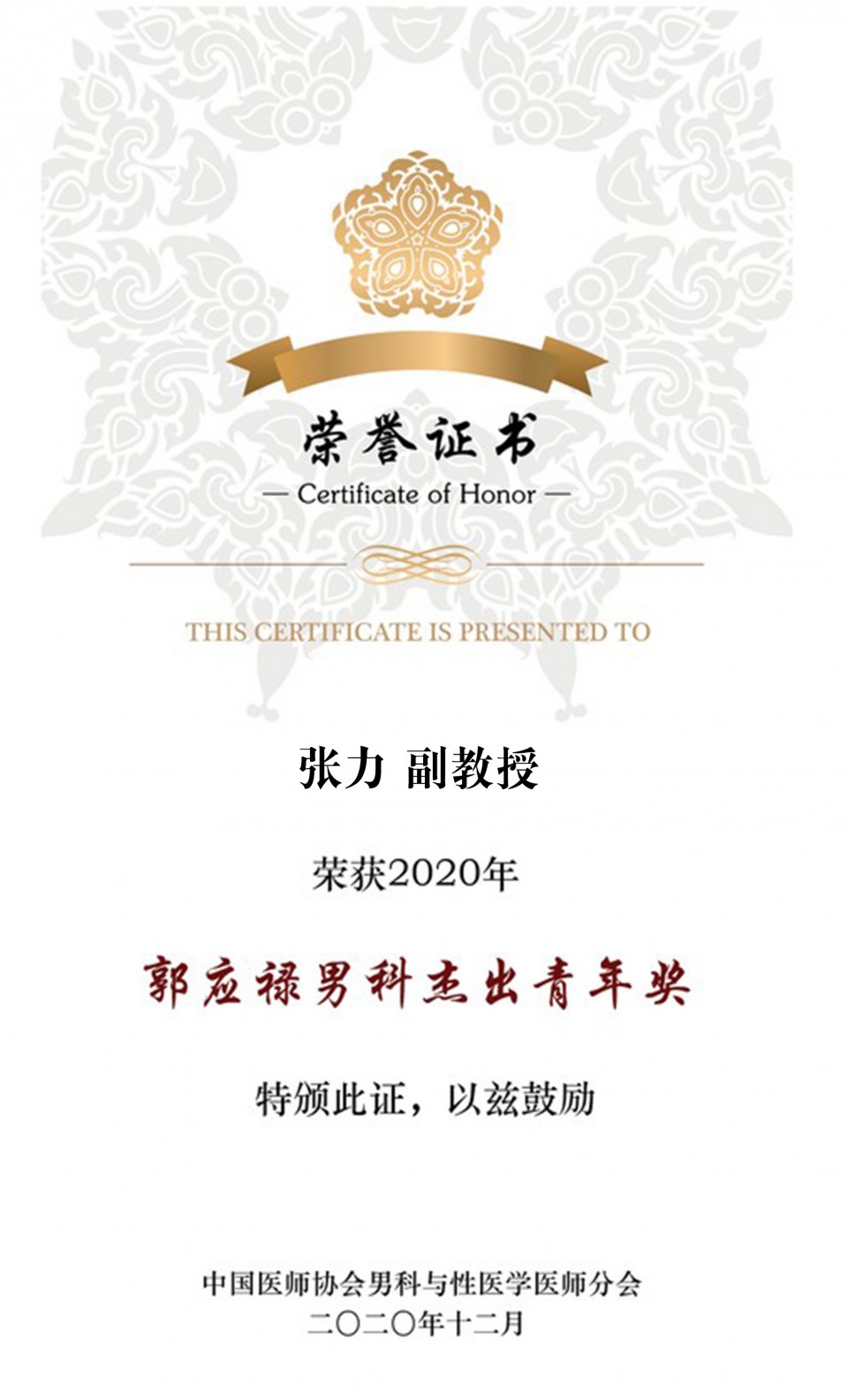 会议还一同颁发了2020“郭应禄男科杰出青年专家奖”,来自全国范围内的青年专家,根据在男科领域的工作贡献、研究成果、学术潜力、同行评价等多方面的成绩进行申报,经过专家推荐、在线答辩两轮评选,最终选出2名获奖人,我院泌尿外科张力副教授荣膺奖项。