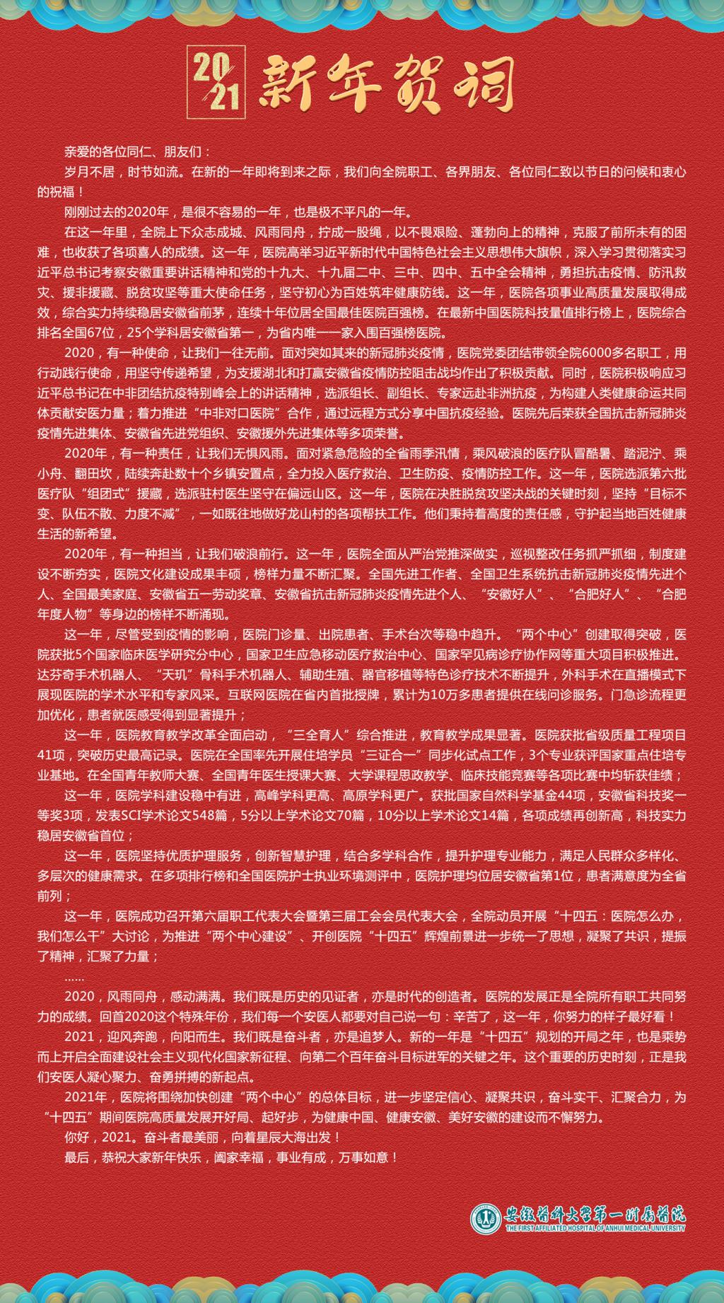 在这一年里,全院上下众志成城、风雨同舟,拧成一股绳,以不畏艰险、蓬勃向上的精神,克服了前所未有的困难,也收获了各项喜人的成绩。这一年,医院高举习近平新时代中国特色社会主义思想伟大旗帜,深入学习贯彻落实习近平总书记考察安徽重要讲话精神和党的十九大、十九届二中、三中、四中、五中全会精神,勇担抗击疫情、防汛救灾、援非援藏、脱贫攻坚等重大使命任务,坚守初心为百姓筑牢健康防线。这一年,医院各项事业高质量发展取得成效,综合实力持续稳居安徽省前茅,连续十年位居全国最佳医院百强榜。在最新中国医院科技量值排行榜上,医院综合排名全国67位,25个学科居安徽省第一,为省内唯一一家入围百强榜医院。