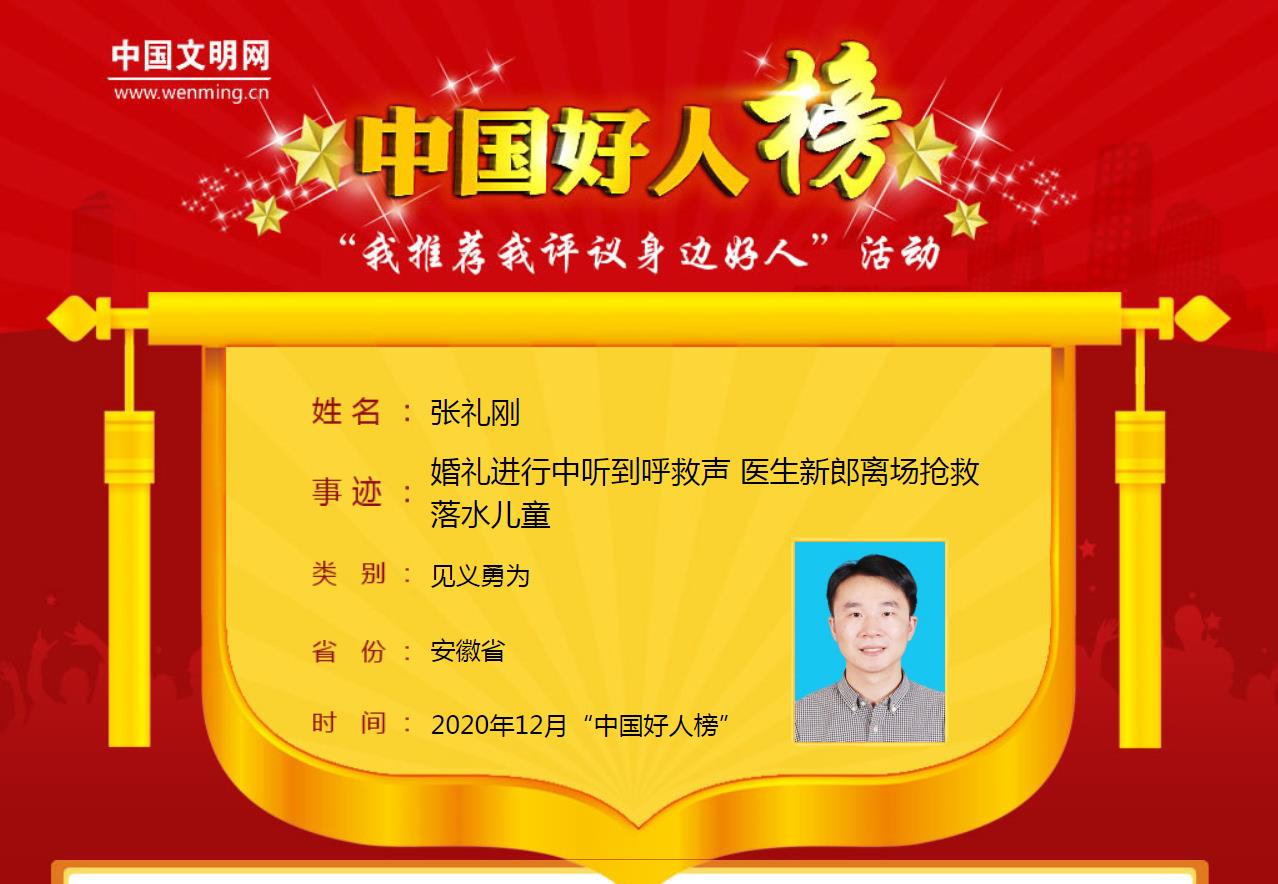 事迹简介:他是安徽医科大学第一附属医院的一名普通青年医生,也是婚礼上勇救溺水儿童的“最帅新郎”。2020年10月6日,张礼刚和妻子正在妻子老家举办回门婚礼宴会,突然听到呼救声。他立刻冲出去救人,最终以精湛的医术使得溺水男孩转危为安。张礼刚救人的事迹得到了媒体的广泛赞誉,国内几乎所有的主流媒体都对张礼刚的结婚救人事迹进行了大幅的报道。