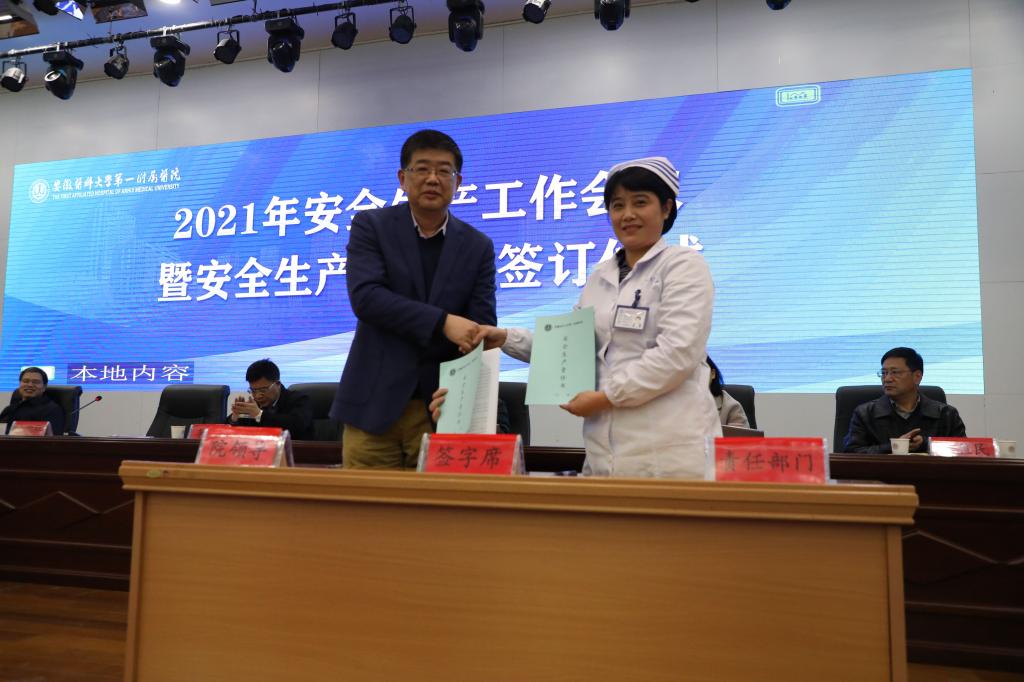 3月17日下午,医院在内科医技楼会议中心召开2021年安全生产工作会议暨安全生产责任书签字仪式。院党委书记金宗祥与各职能部门代表签订了2021年《安全生产责任书》。会议由党委副书记戴晓支主持。