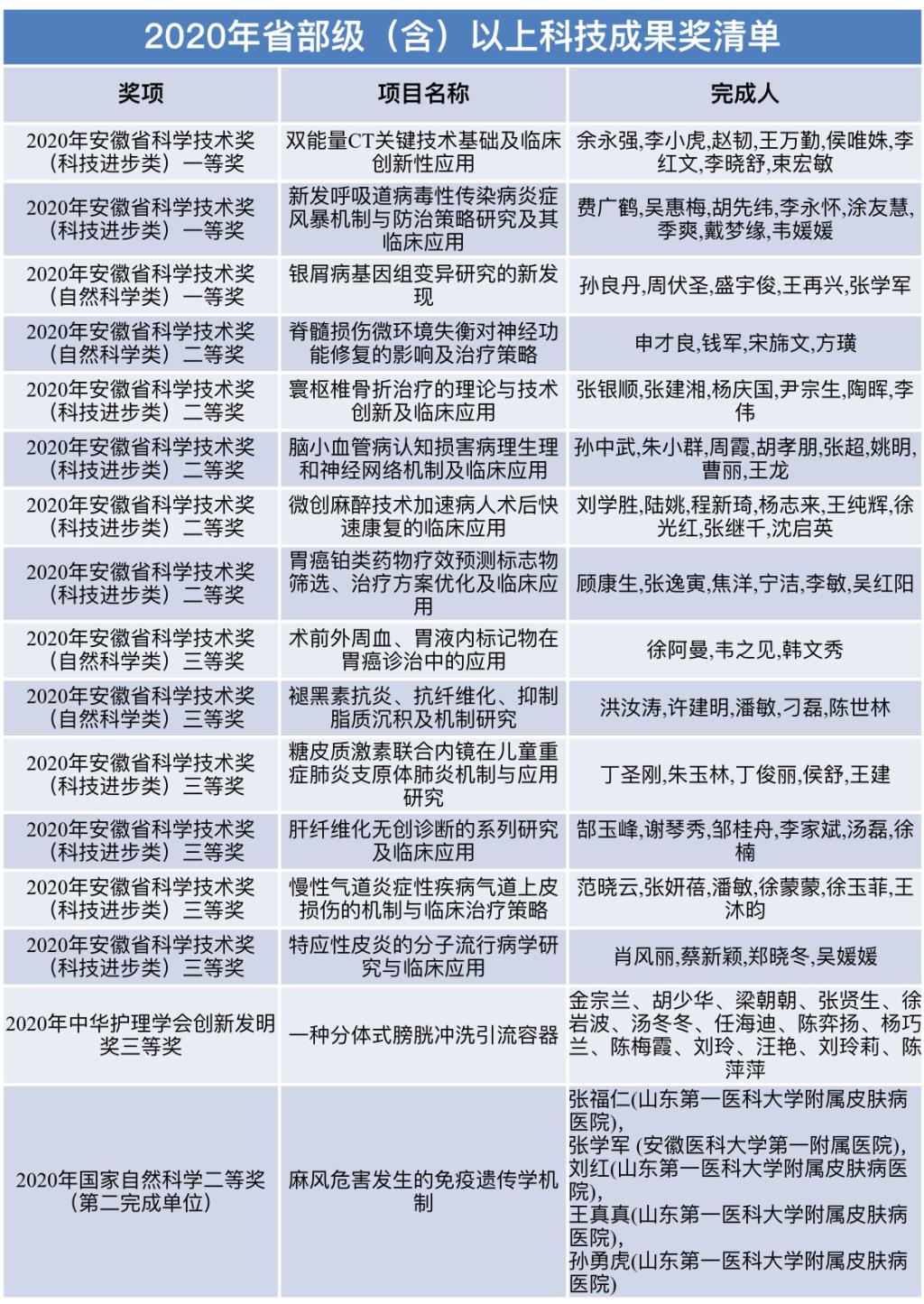 2020年是丰收的一年,除安徽省科学技术奖收获颇丰外,医院还以第二完成单位身份荣获2020年国家自然科学奖二等奖1项;此外,还获得中华护理学会创新发明奖三等奖1项。