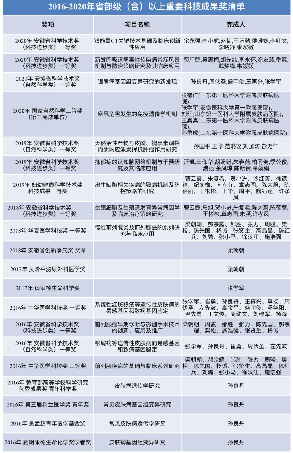 “十三五”期间,医院获得省部级(含)以上科研奖项63项,较“十二五”期间增加29项,增幅达85.3%。具体包括:中华医学科技奖一等奖1项、二等奖1项;教育部青年科学奖1项;华夏医学科技奖一等奖1项;安徽省科学技术奖50项(一等奖8项、二等奖17项、三等奖25项);安徽省创新争先奖奖章1项;树兰医学青年奖1项;谈家桢生命科学奖1项、妇幼健康科学技术奖科技成果一等奖1项、二等奖1项;吴阶平泌尿外科医学奖1项;吴孟超青年医学基金奖1项;药明康德生命化学奖学者奖1项;中华护理学会创新发明奖三等奖1项。