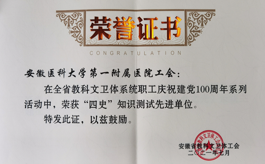在此次系列活动中,医院广大职工积极参与《四史》知识测试,获得全省教科文卫体工会系统《四史》知识测试先进单位荣誉称号。