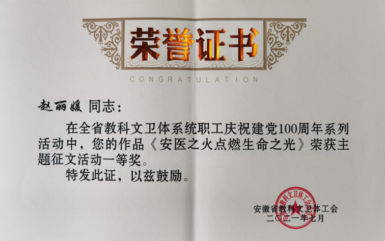 今年三月,院工会在广大职工中开展“中国梦•劳动美•心向党”主题征文活动,并从全院职工积极投稿的征文中精心挑选出8篇参加全省的比赛。其中,赵丽媛的《安医之火点燃生命之光》荣获主题征文一等奖,戴芬《余香》、郑娟《江桥》获二等奖,万磊《我在武汉金银潭》、王琼琼《患者们和我们》、汤玉霞《在党旗下成长》获三等奖。