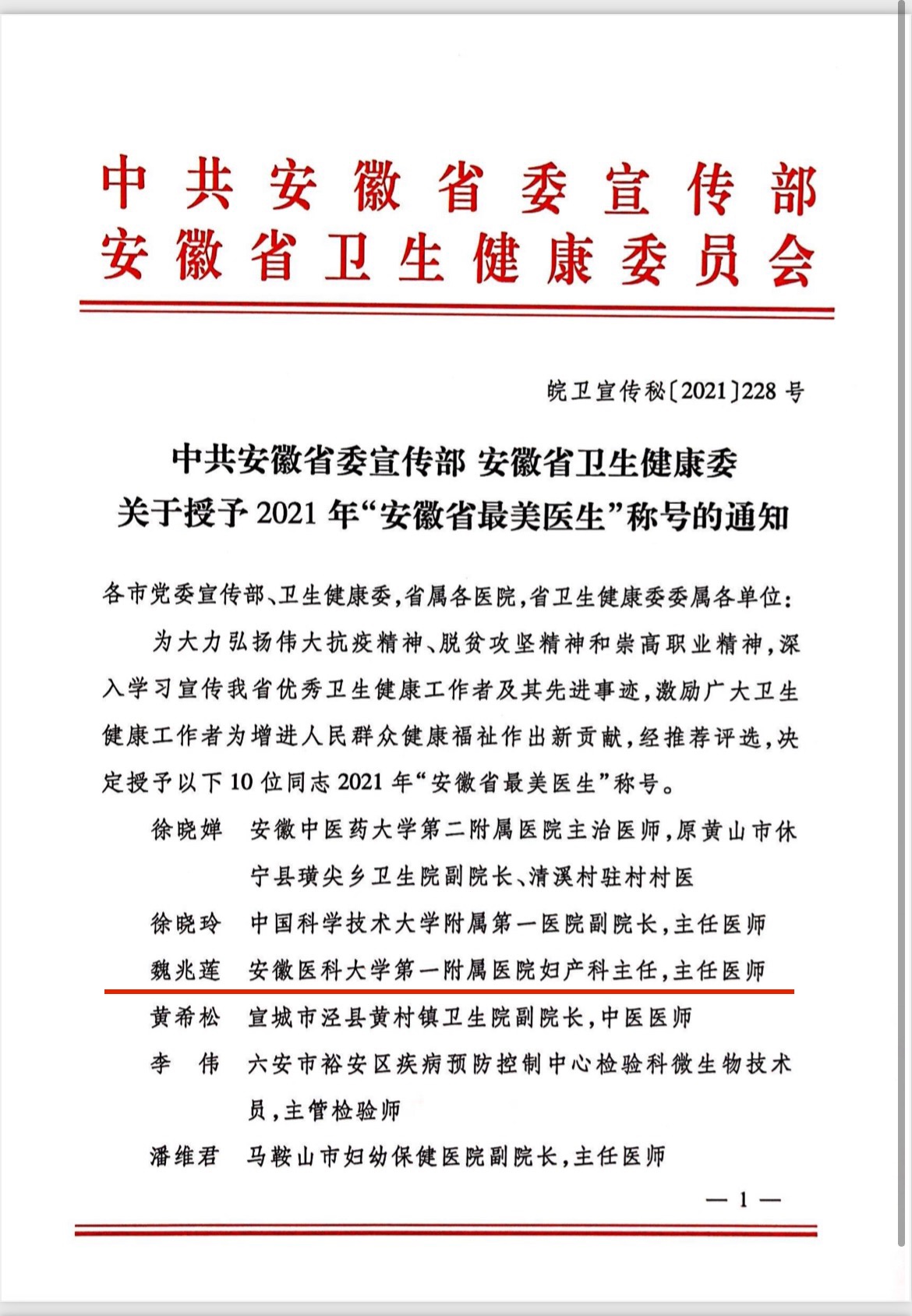 为大力弘扬伟大抗疫精神、脱贫攻坚精神和崇高职业精神,深入学习宣传安徽省优秀卫生健康工作者及其先进事迹,激励广大卫生健康工作者为增进人民群众健康福祉作出新贡献,在2021年“中国医师节”到来之际,安徽省委宣传部和省卫生健康委联合开展了2021年“安徽省最美医生”评选活动,我院妇产科主任医师魏兆莲荣获2021年“安徽省最美医生”称号。