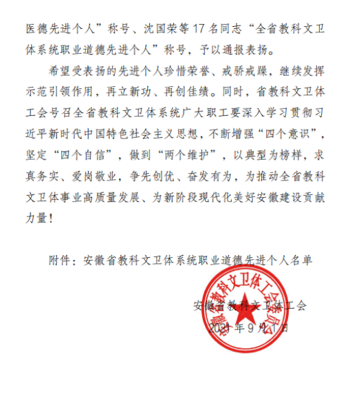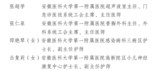 近日,在安徽省教科文卫体工会刚刚公布的《关于选树安徽省教科文卫体系统职业道德先进个人的通报》中,我院普胸外科张仁泉主任、超声波室张超学主任、感染病科三病区邱艳琴护士长、小儿神经康复中心吕复莉护士长获得“医德先进个人”荣誉称号。