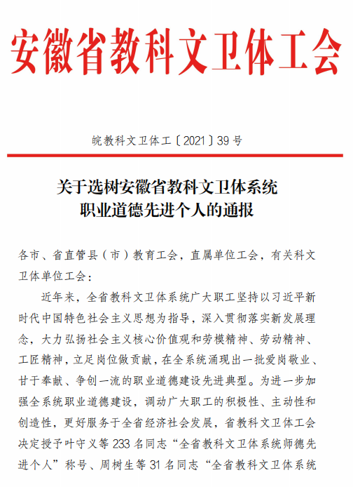 据悉,为认真学习习近平新时代中国特色社会主义思想,深入贯彻落实新发展理念,大力弘扬社会主义核心价值观和劳模精神、劳动精神、工匠精神,进一步加强职业道德建设,调动广大职工的积极性、主动性和创造性,立足岗位做贡献,更好服务于全省经济社会发展,省教科文卫体工会开展了此次职业道德先进个人的选树活动。