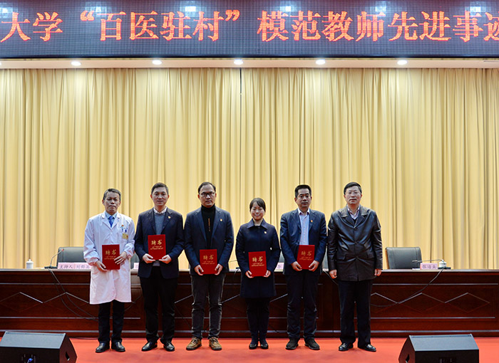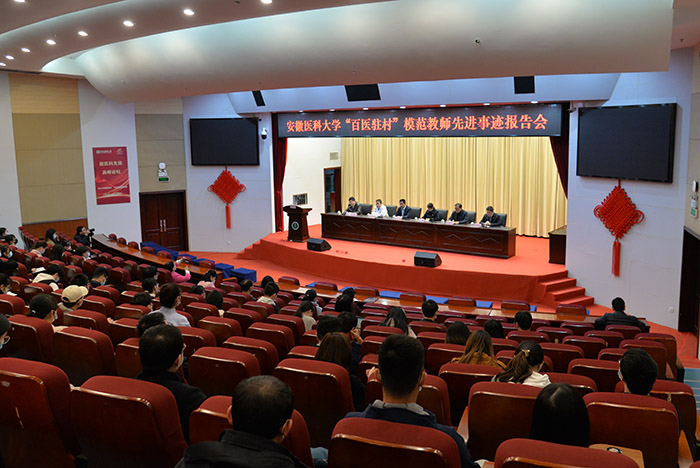 11月17日下午,安徽医科大学“百医驻村”模范教师先进事迹报告团首场报告会在图书馆第一学术报告厅举行。作为我院“百医驻村”的专家代表,消化内科副主任医师李邦库受邀参加,并讲述了我院4位专家扎根基层、服务人民的感人故事,给学校教师和辅导员上了一堂特殊的党史学习教育“专题党课”和“师德师风教育课”。校党委副书记刘群英主持报告会,并为“百医驻村”模范教师代表颁发学校思政理论课(实践)兼职教师聘书。