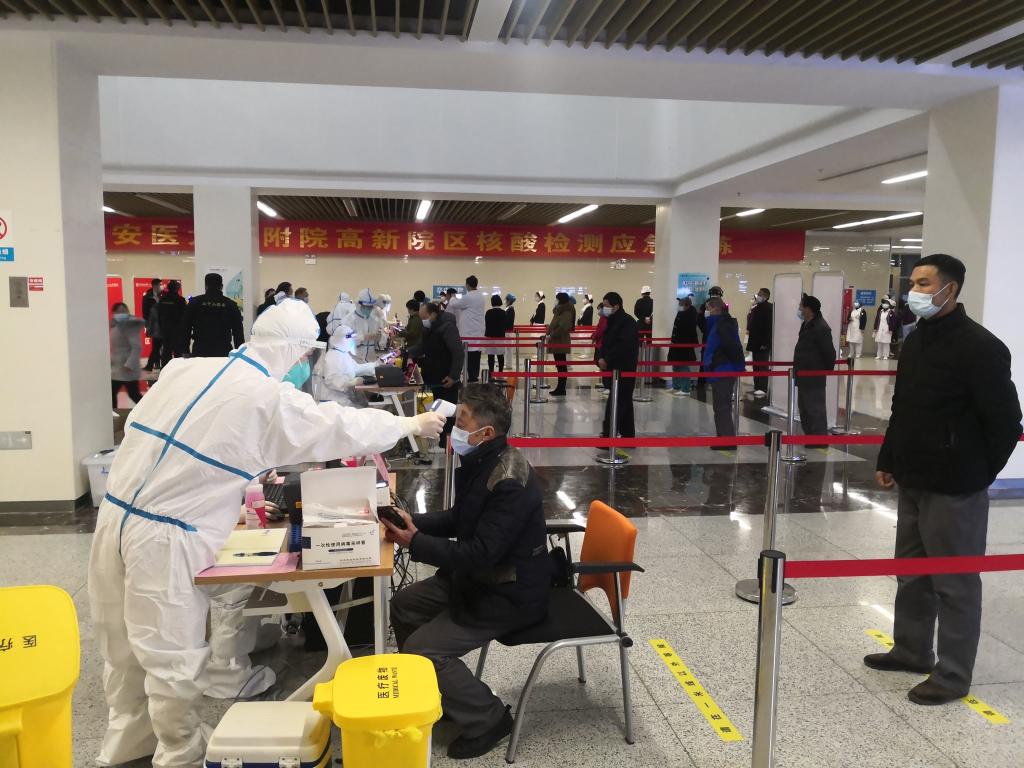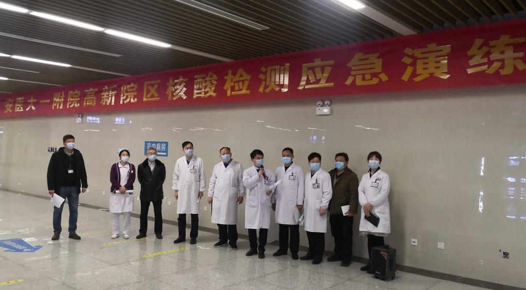 本次演练采取现场实战方式进行,假定为“接医院核酸检测实验室报告,当日下午一例社会‘愿检尽检’人员新冠核酸检测结果提示异样”,报告院区领导、高新区疾控中心及高新区管委会后,经院区疫情防控领导小组研究决定,院区实行临时管控,组织门诊区域医患进行全员核酸检测。