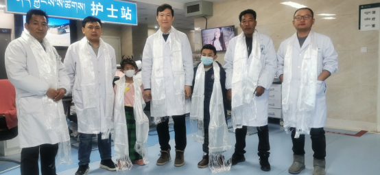 经过3天的治疗,两名患儿顺利康复。在得知援藏专家即将返程,两位小朋友坚持从病床上下来,为医生叔叔献上洁白的哈达,表示感谢。