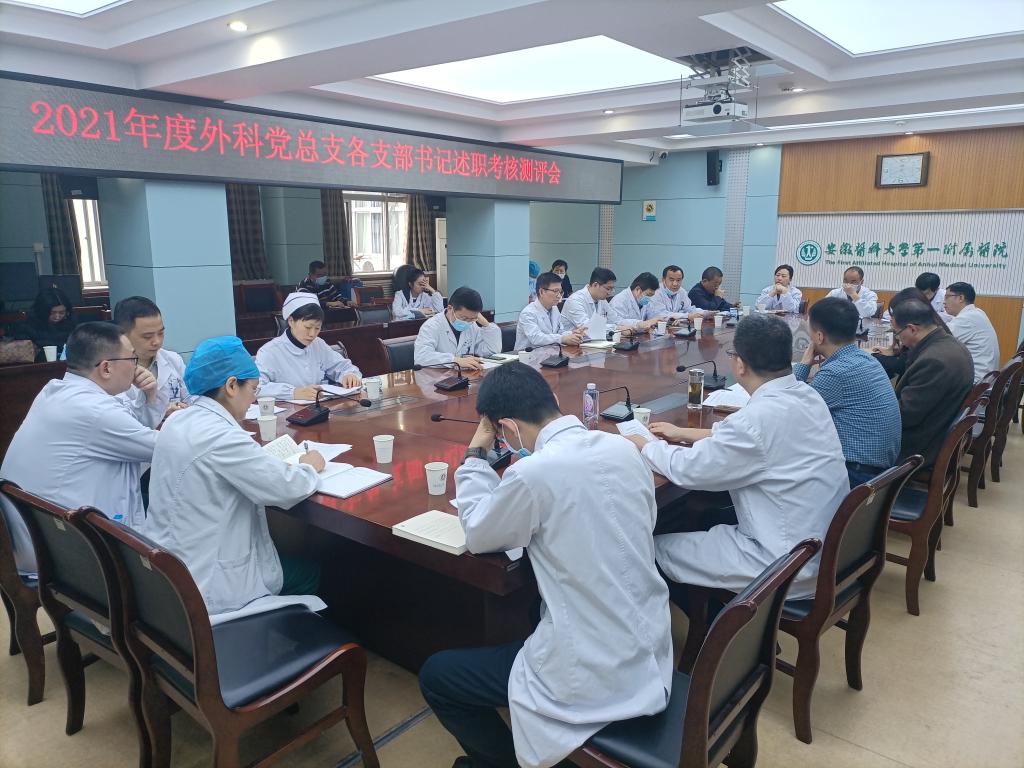 胡先平首先传达了医院《关于开展2021年度基层党组织书记抓党的建设述职评议考核工作的通知》文件精神和具体要求。十四位外科党支部书记从基层党组织标准化建设、党史学习教育、学习贯彻党的十九届六中全会精神、党风廉政建设、党支部加强意识形态工作、组织开展“我为群众办实事”系列活动、支部在新冠肺炎疫情常态化防控工作中发挥的重要作用和支部在学科发展中的引领作用等多方面进行阐述,胡先平对各支部述职优点及不足逐一点评。