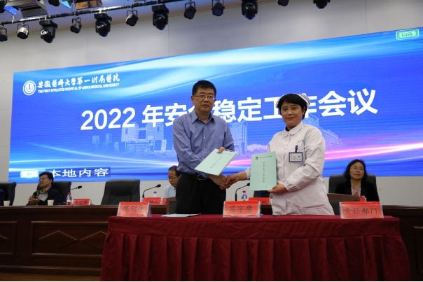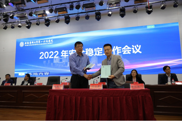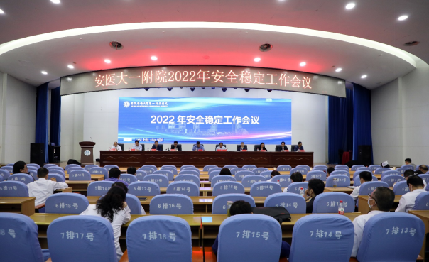 4月8日下午,安徽医科大学第一附属医院2022年安全稳定工作会议在内科医技楼四楼会议中心召开。院党委书记金宗祥作工作报告,党委副书记、副院长刘全礼主持会议。院领导李家斌、费广鹤、王珩、李琮、陈旭林、谢峰、丁长明出席会议。