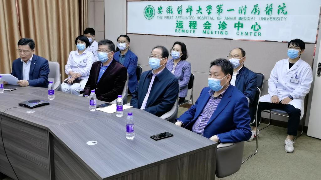 连线中,上海复兴馆方舱医院安医大一附院方舱院区代表陈明卫,专家指导组成员马红秋、郜玉峰、丁颖颖,合肥省属医院检验援沪团队成员胡文君等5名抗疫队员,分别汇报了医疗队在医疗救治、院感防控、核酸检测等方面的工作及队员生活情况。队员们纷纷表示,医院给予医疗队的全方位关心和支持,令医疗队员们倍感温暖,医疗队必将凝心聚力、攻坚克难,坚决打赢上海疫情防控阻击战这场大仗硬仗。