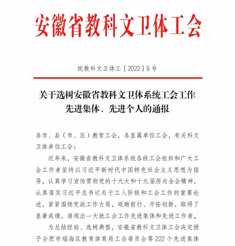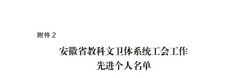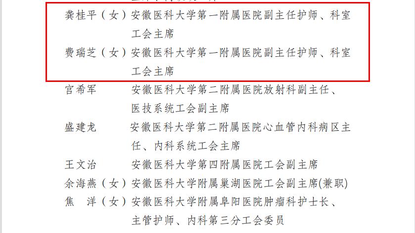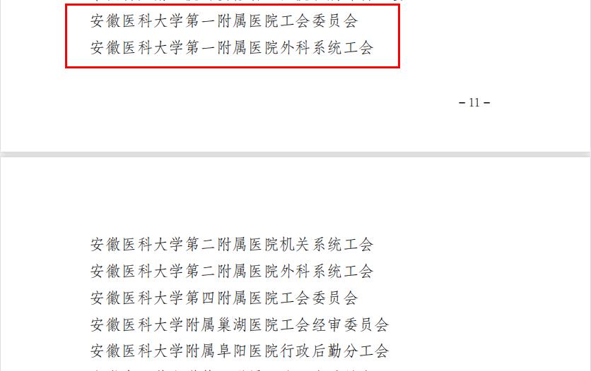 近日,省教科文卫体工会下发《关于选树安徽省教科文卫体系统工会工作先进集体、先进个人的通报》,对获得系统工会工作先进荣誉的集体和个人进行通报表扬,医院工会和外科系统工会荣获“安徽省教科文卫体系统工会工作先进集体”称号,神经内科第一工会主席龚桂平和急诊内科工会主席费瑞芝荣获“安徽省教科文卫体系统工会工作先进个人”称号。
