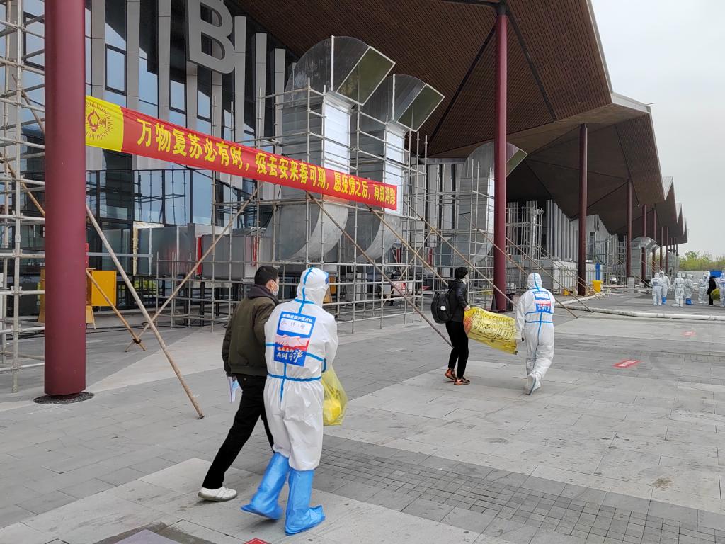 4月13日,上海气温大幅下降,下起大雨。风雨中,“大白”们为上海崇明复兴馆方舱医院安医大一附院院区386名出舱患者撑伞送行。