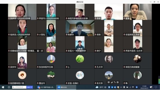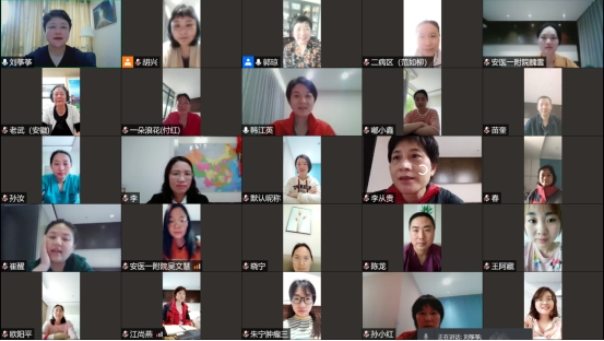 4月23日下午,安徽省护理学会理事长武义华和秘书长李志菊线上慰问我院援沪医疗队队员。安徽省护理学会心理护理专委会主委郭琼为队员减压赋能实操培训,为队员提供心理支持。会议由上海崇明复兴馆方舱医院安医大一附院院区护理组组长韩江英主持,上海崇明复兴馆方舱医院安医大一附院院区临时党总支书记、院长陈明卫、院护理部主任胡少华参加会议。