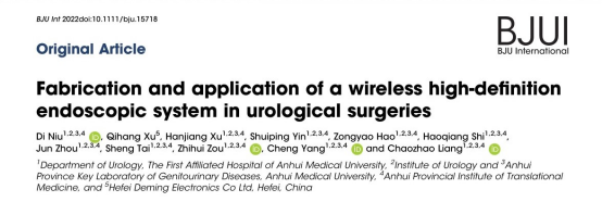 2022年3月,安徽医科大学第一附属医院泌尿外科梁朝朝教授团队题为《Fabrication and application of a wireless high-definition endoscopic system in urological surgeries》的研究论文发表在泌尿外科领域著名期刊“英国泌尿外科杂志”BJU International (专科著名期刊,JCR一区),该杂志主要发表泌尿外科领域具有重大临床意义的临床研究型文章,是世界范围内泌尿外科医师最关注的期刊之一。梁朝朝教授团队这篇论著文章主要介绍了该团队和有关单位共同研发的无线智能超高清腔镜系统,并与国外知名品牌高清腔镜系统在图像分辨率、色彩分辨率、成本、重量等方面进行比较,杂志编辑及多位审稿人对该系统表示高度认可。梁朝朝教授和杨诚教授为本文通讯作者,牛迪博士为本文第一作者。近五年中国学者每年在该期刊仅发表十余篇文章,本文是梁教授团队在BJU International杂志发表的第四篇original article,也是安徽省时隔13年在该杂志上发表的第五篇文章。