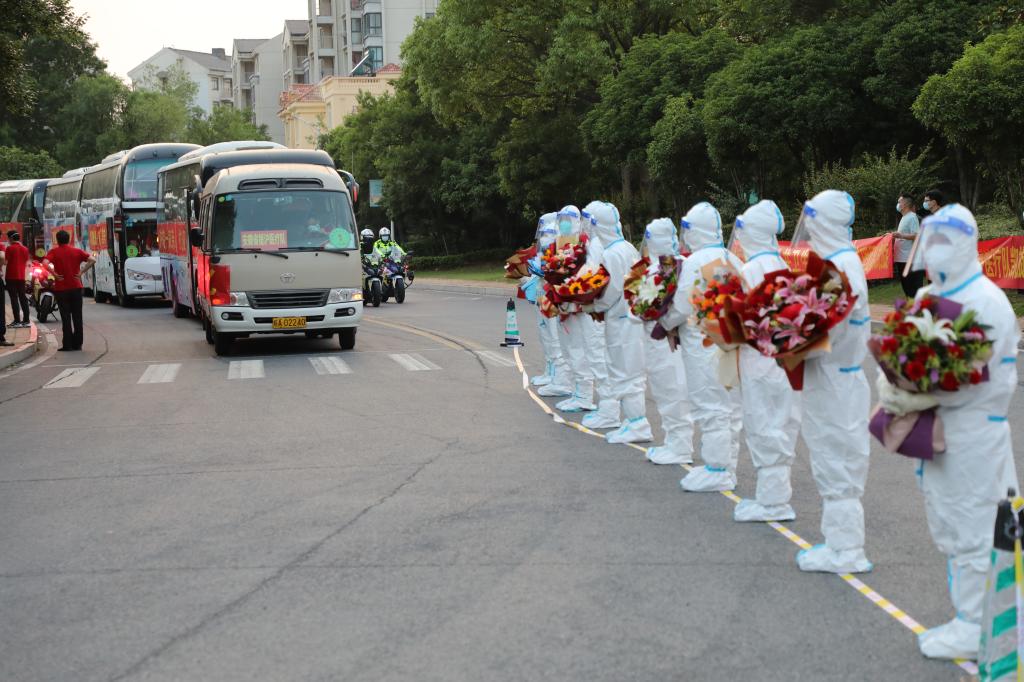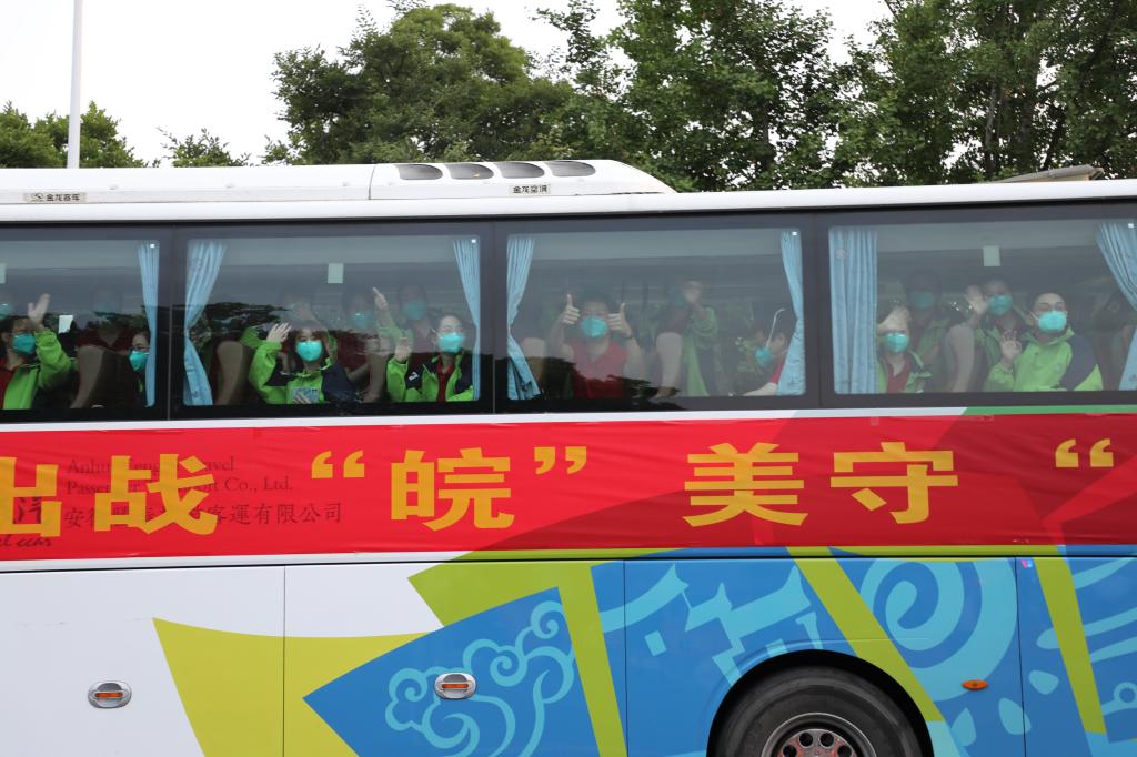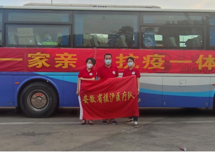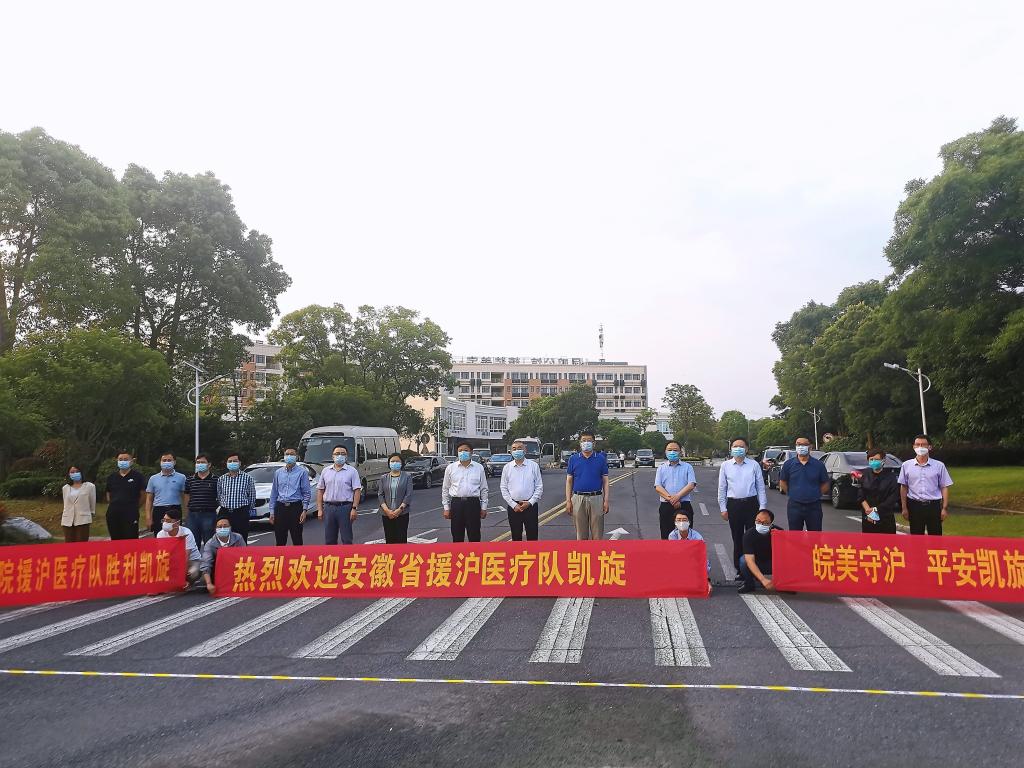 5月23日上午11时,安医大一附院援沪医疗队和3名我院选派的上海市安徽方舱医院专家组成员,圆满完成支援上海抗疫任务,乘坐大巴踏上归程。上海市委市政府领导,上海市卫健委、崇明区政府和上海新华医院领导前往驻地酒店为队员送行。