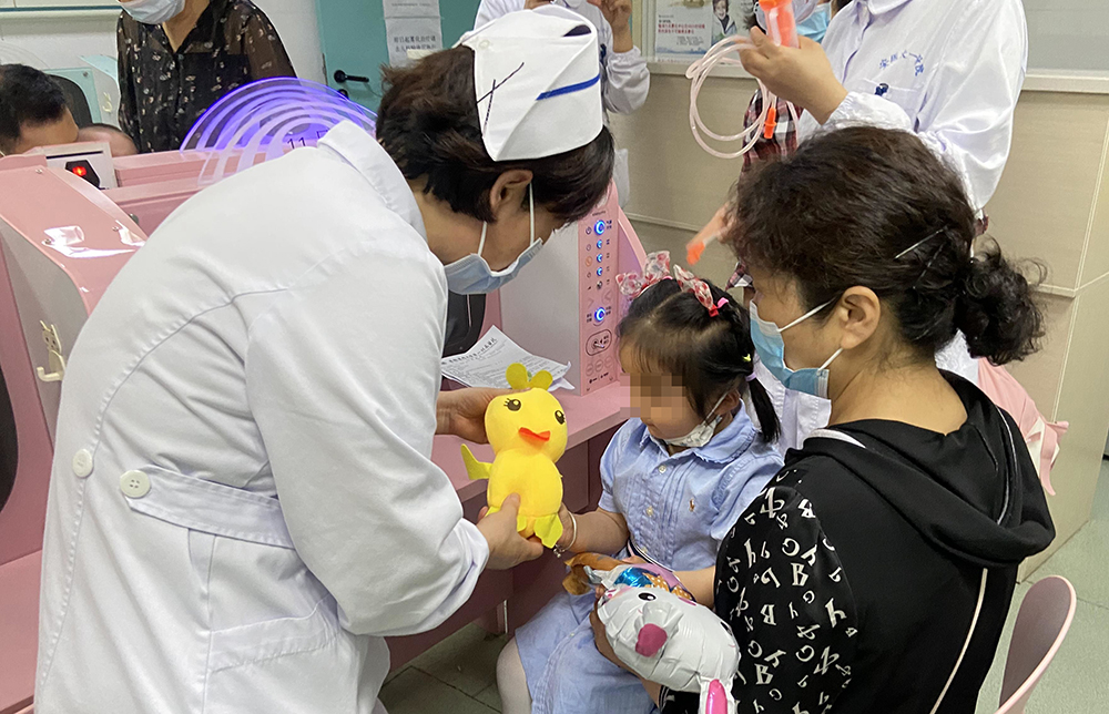 在儿科门诊输液厅,医护人员在向小朋友们赠送节日礼物、祝福节日快乐的同时,还开展了健康科普活动,他们向在等候区的家长讲授并现场演示了海姆立克急救法,这项关键时刻能挽救生命的实用技能受到现场家长的热烈欢迎。