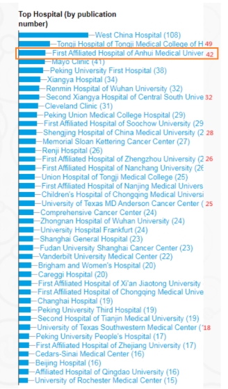 同样值得提及的是,发文全球前40家医院中,除了美国Mayo医学中心和Cleveland诊所等10家顶级欧美国家医院外,其余30家医院均来自中国医院。