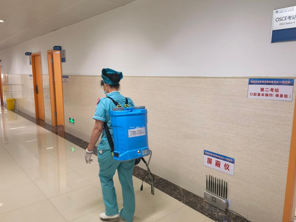 医院高度重视考试工作,要求新冠肺炎疫情防控和考务考试工作并重。在疫情防控方面,基地开考前对所有考官考务人员近14天内行程进行摸排,要求提供考前48小时内阴性核酸报告;考试期间,考场设置了考生预检处,考生须按照一米线有序排队,出示“安康码”、“行程码”,双码、体温、48小时内核酸报告正常且做好防护的考生方可进入考生候考通道,候考通道逐一审核《考生健康申明承诺书》;考官须双码、体温正常方可进入考场;考场配备了充足的疫情防护用品和设置了疫情专用通道、疫情备用考组,安排专人早中晚进行考场消毒和通风。