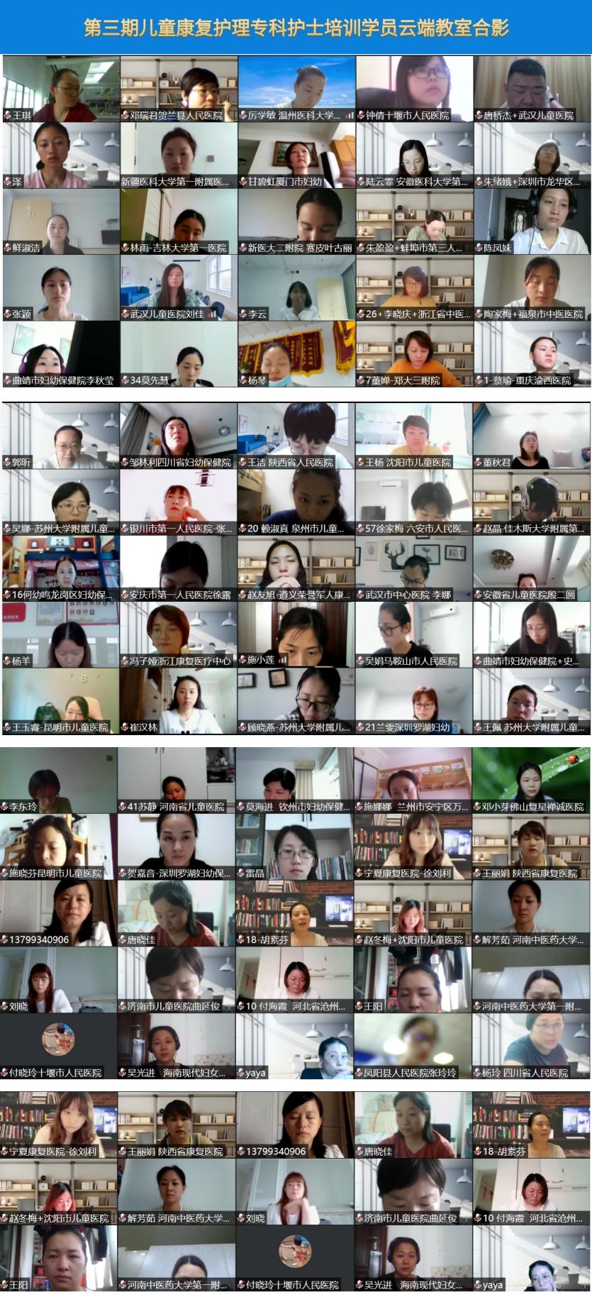 由于全国疫情防控要求,本次培训班采取线上理论授课1个月+线下临床实践2个月相结合的创新模式进行培训。为了保证培训质量,中国康复医学会康复护理专业委员会遴选了国内知名的医疗及护理专家前来授课,在授课之前根据前两届学员反馈与专家进行了一一沟通。授课内容主要涵盖儿童康复治疗、儿童康复护理前沿、儿童康复护理专业技术、儿童康复中医护理适宜技术、护理管理和科研等主要内容,在前期总结和反馈的基础上延长了科研工作坊、中医康复的授课时长,增设了“儿童人体发育学”的授课内容。理论授课结束后学员将被分派到全国各个实践基地进行儿童康复护理临床实践。来自全国的近百名学员借此机会认真学习、互相交流。
