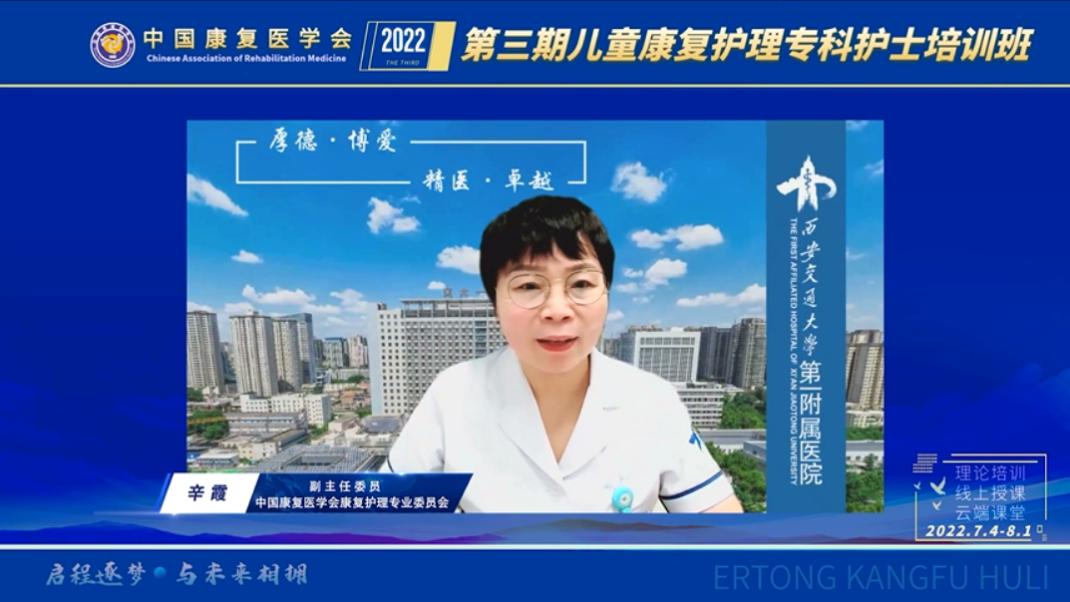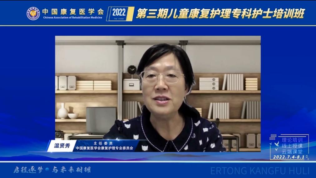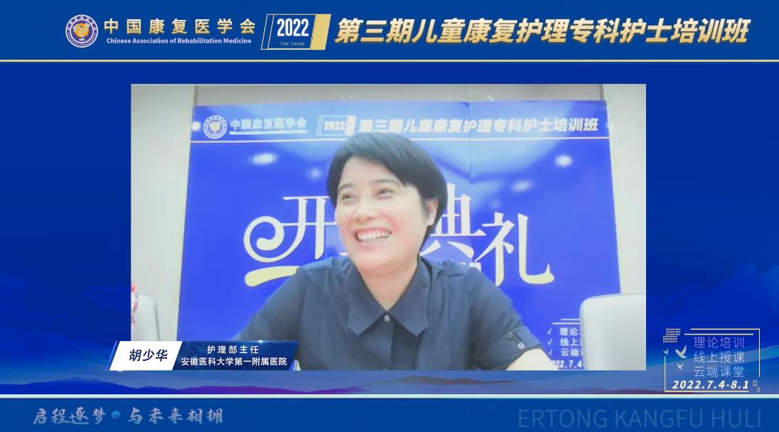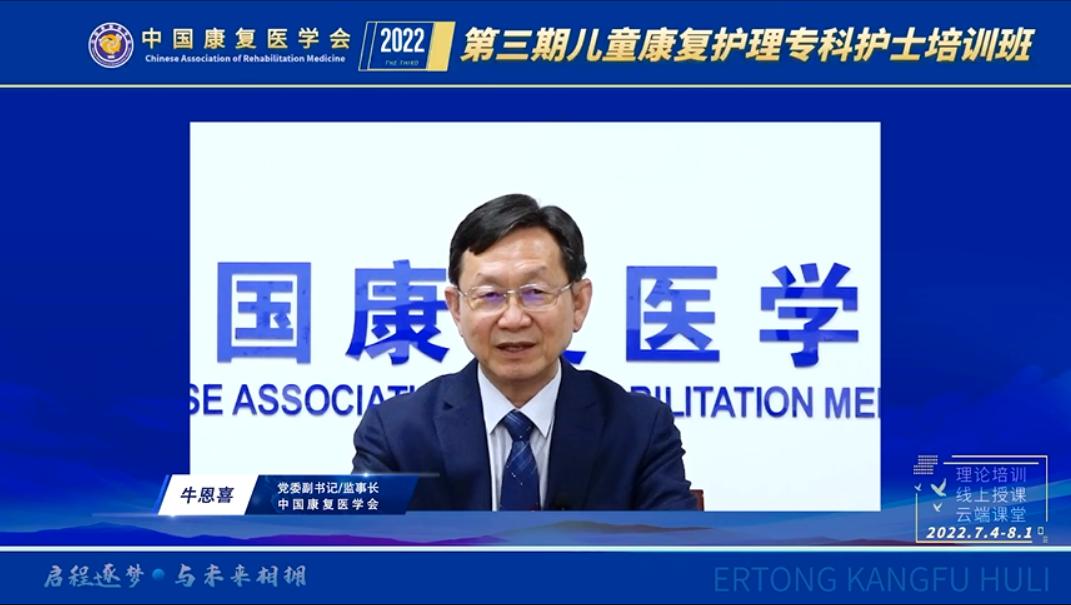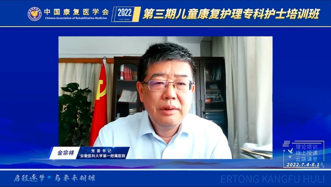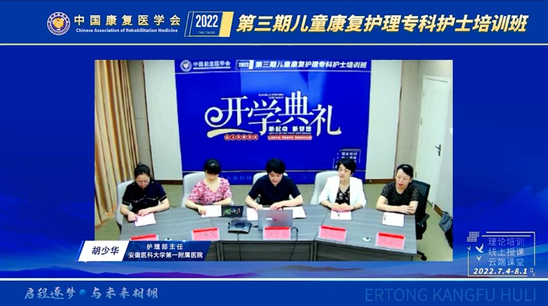 7月4日,中国康复医学会第三期儿童康复专科护士培训班开班仪式在线上举行。医院党委书记金宗祥致辞。开幕式邀请了中国康复医学会党委副书记、监事长牛恩喜,中国康复医学会副会长燕铁斌,中国康复医学会康复护理专业委员会主任委员温贤秀,中国康复医学会康复护理专业委员会副主任委员辛霞。来自全国25个省市、64家医院的79位学员齐聚云端,会议由医院护理部主任胡少华主持。