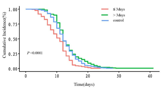 图注:病毒阴转时间的Kaplan-Meier曲线。 红线:≤3天组; 绿线:>3天组; 蓝线:对照组。≤3天用药组与对照组之间P <0.0001;>3天用药组与对照组之间P =0.0176;≤3天用药组和>3天组之间P <0.0001。