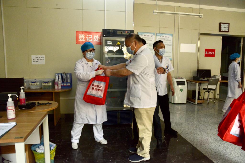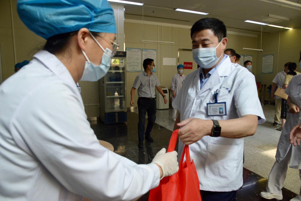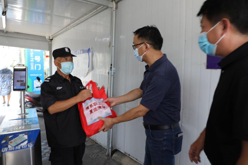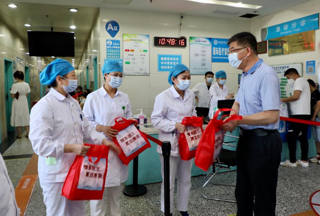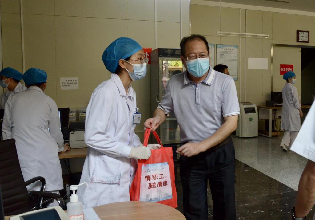 为把关心关爱职工工作落到实处,切实做好职工夏季防暑降温工作,近日,医院党委书记金宗祥、执行院长孙倍成、党委副书记、副院长刘全礼、副院长吴晓莉、正处级组织员丁长明、高新院区副院长徐阿曼在工会、门诊部、保卫处、高新院区等相关部门负责人陪同下,分赴院本部、高新院区开展岗位“送清凉”活动。为在高温下坚守岗位的一线职工送去一份清凉,送上一声“你们辛苦了!”。