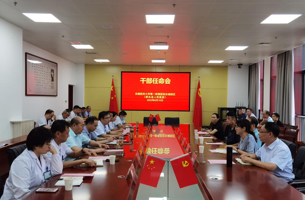 8月11日下午,安医大一附院东城院区(肥东县人民医院)召开干部任命会议,宣布财务科、护理部第一负责人任命决定。安医大一附院党委副书记、副院长刘全礼,党委组织部副部长汪俊兰、医务处院际医疗部主任袁克勇,东城院区领导班子及行政职能科室负责人参加会议。