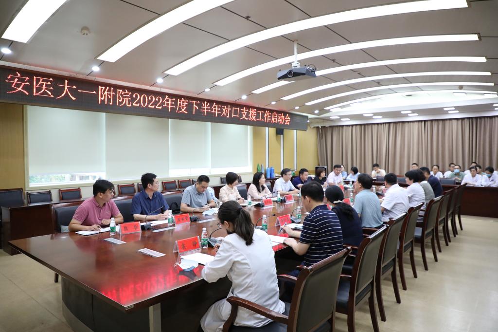 8月17日上午,2022年度下半年对口支援工作启动会在干部保健中心二楼会议室举行。安徽省卫健委医政医管处副处长彭玉池、安徽省卫健委人事处张卓然主任、我院执行院长孙倍成、常务副院长李家斌、受援单位负责人出席会议。会议由常务副院长李家斌主持,相关职能部门负责人及部分对口支援队员参加了会议。
