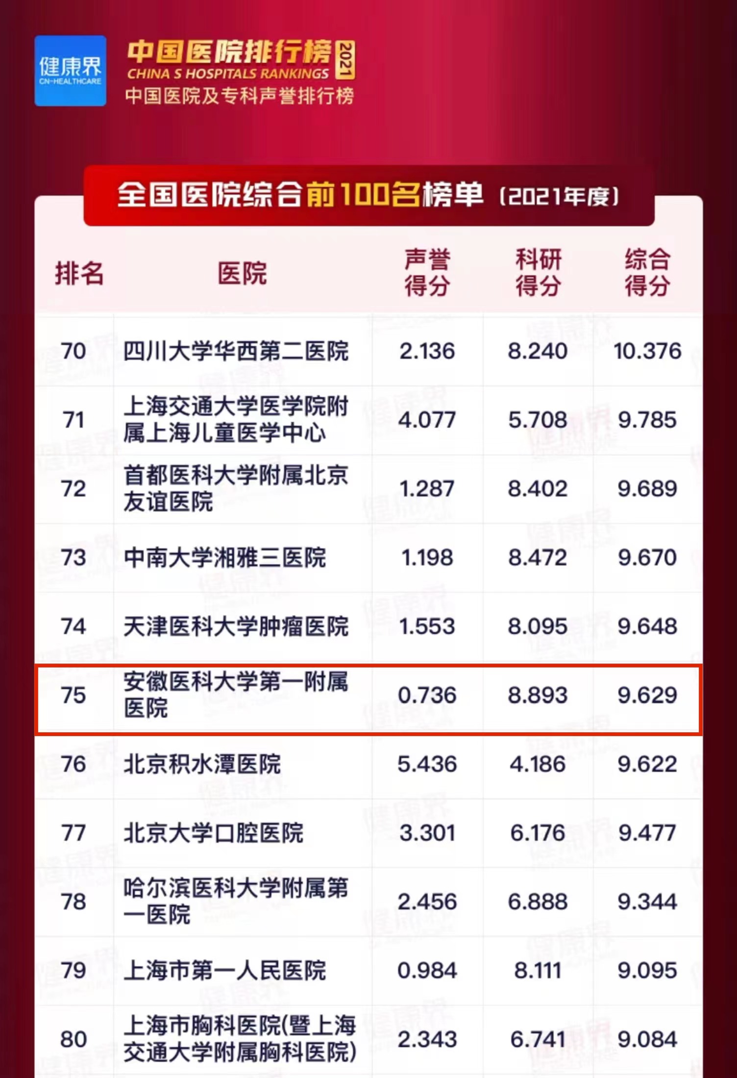 11月20日下午,由复旦大学医院管理研究所发布的《2021年度中国医院综合排行榜》和《2021年度中国医院专科声誉排行榜》正式出炉。安医大一附院综合排名全国第75位,华东地区第15位,安徽省第一。其中科研学术排名全国第45位,较去年上升5位。在此前发布的2021年中国医院科技量值排行中,安医大一附院综合排名全国第61位,综合实力稳居安徽省首位。