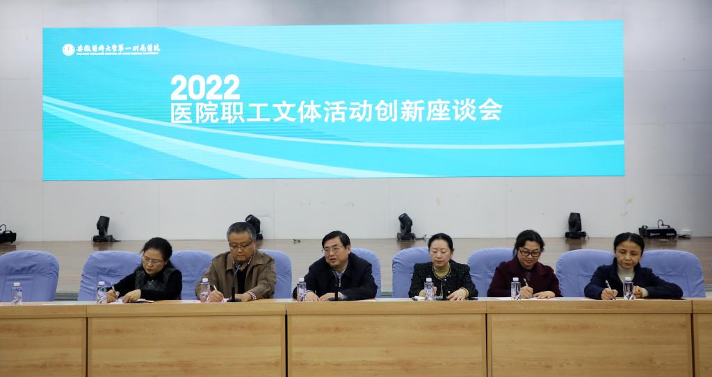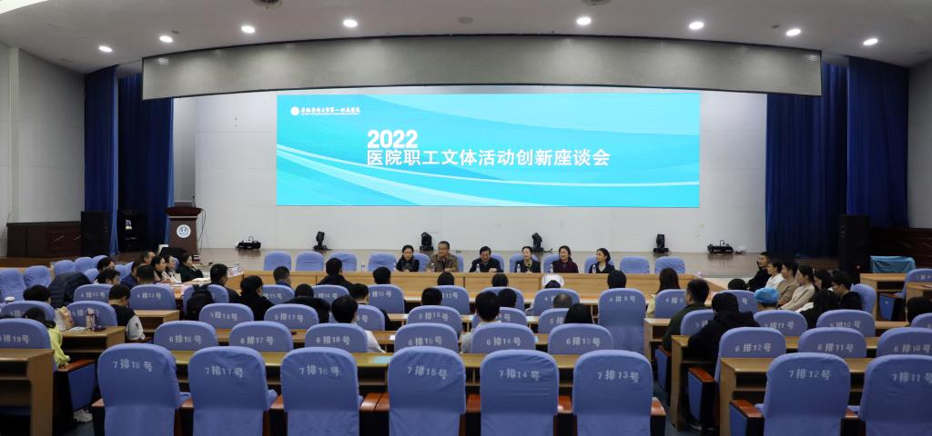 为提升医院职工文体活动内涵,进一步丰富职工业余文体生活,医院在会议中心举行了2022年医院职工文体活动创新座谈会。校党委副书记、院党委书记谢瑞瑾,副院长吴晓莉出席会议并讲话,医院各文体协会负责人、职工文体活动积极分子代表、院工会有关同志等近50人参加座谈。座谈会由院工会主席黄尧主持。