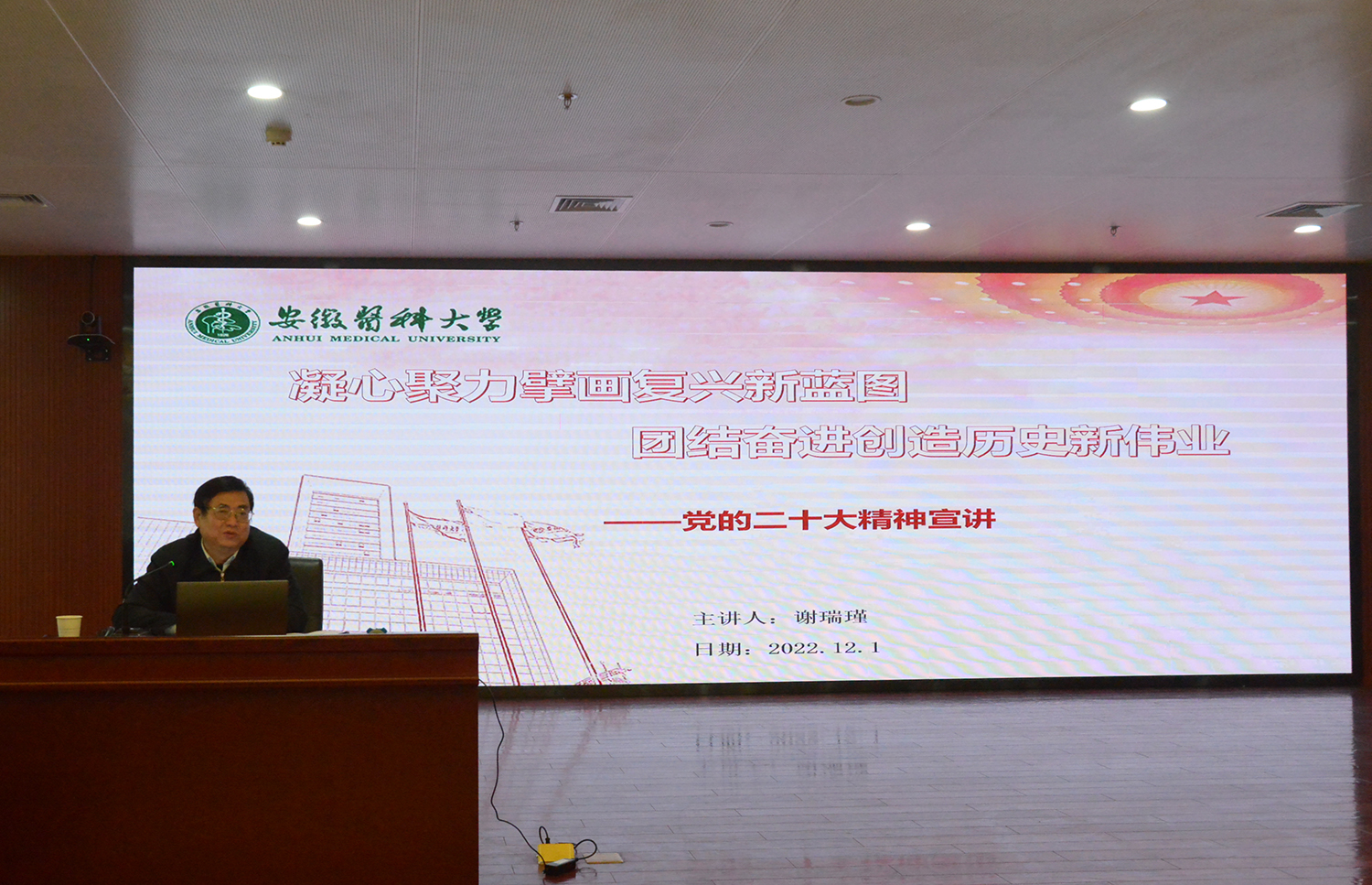 谢瑞瑾以《凝心聚力擘画复兴新蓝图团结奋进创造历史新伟业》为题,从深入领会党的二十大重点内容、过去五年的工作和新时代十年的伟大变革、开辟马克思主义中国化时代化新境界、新时代新征程中国共产党的使命任务、党的二十大战略部署、未来怎么干六个方面出发,对党的二十大精神进行了系统讲解和深入阐释。