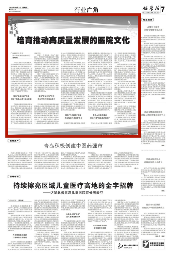 《健康报》2022年12月02日第7版刊发了校党委副书记、院党委书记谢瑞瑾署名文章——《培育推动高质量发展的医院文化》。全文如下: