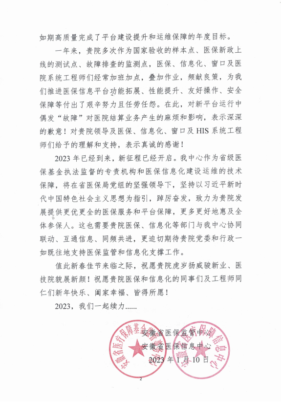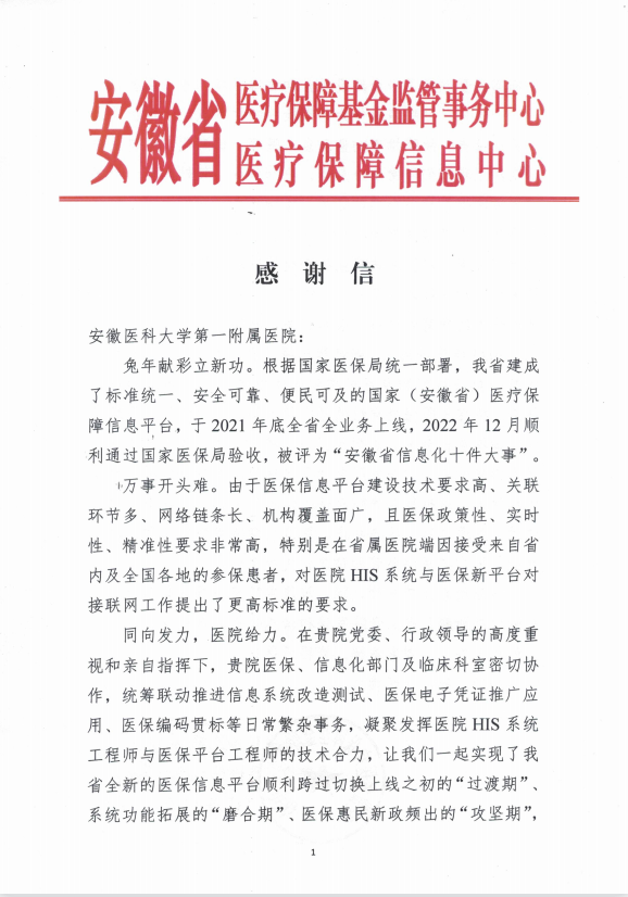 近日,安徽省医保信息中心给医院发来感谢信,感谢医院积极配合省医保局顺利建成国家(安徽省)医疗保障信息平台。该项目入选“安徽省信息化十件大事”。